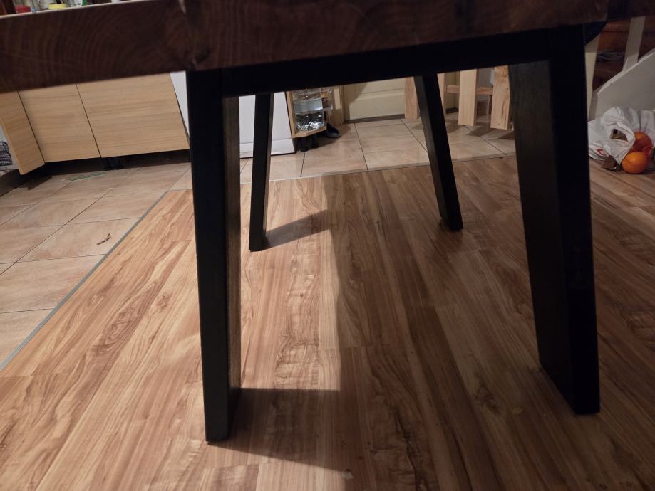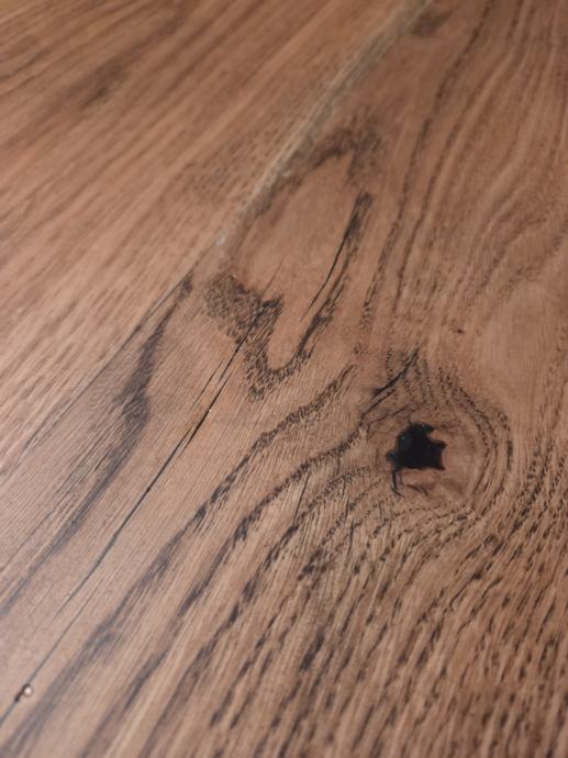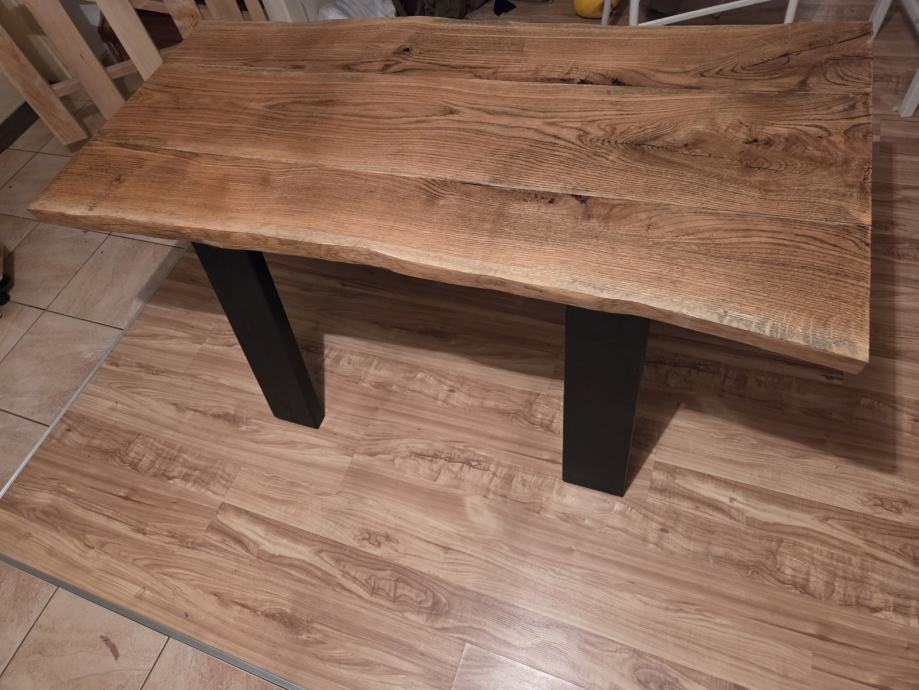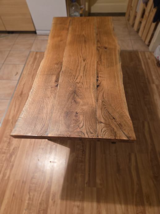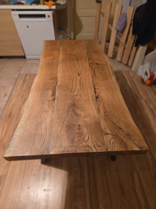 Drugi stol je dimenzija 140 cm x 60-70 cm, ručni rad, preliven epoxy smolom i uljen. Njegova cijena je 500 eura.