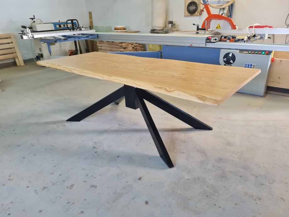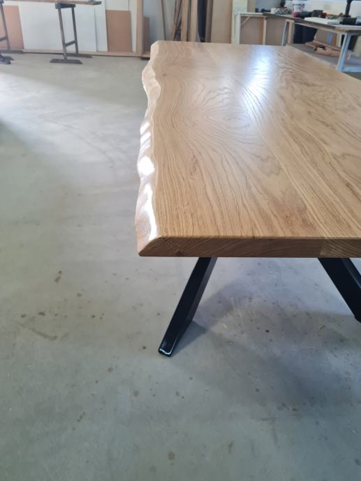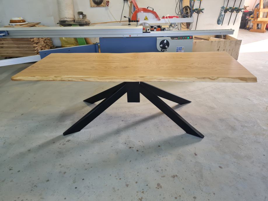 Moderan blagovaonski stol u kombinaciji sa metalnim postoljem i hrastovom pločom.