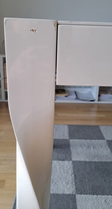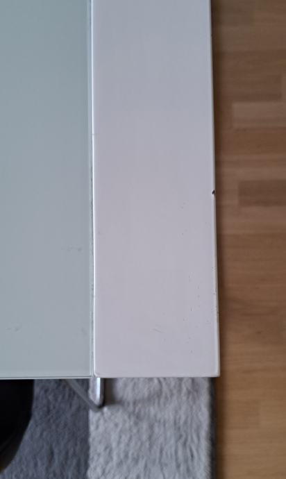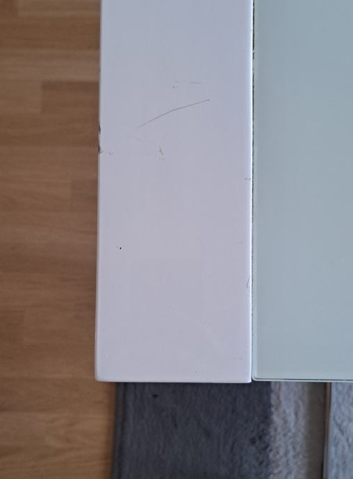 Konstrukcija od bijelo lakiranog drva, gornja ploča od stakla na bijeloj podlozi.
