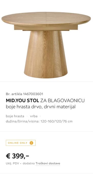 Prodajem novi stol kupljen preko lesnininog web shopa. Razlog prodaje je sto nam boja ne odgovara (boja hrasta je nesto tamnija nego na slikama). Stol je montiran i koristi se cca 2 mjeseca. Stvarno kao nov, trebalo bi ga rastavit prije iznošenja. Cijena na lesnininoj stranici je 400e plus dostava. Samo ozbiljni kupci