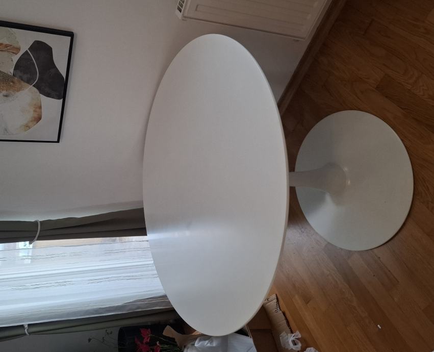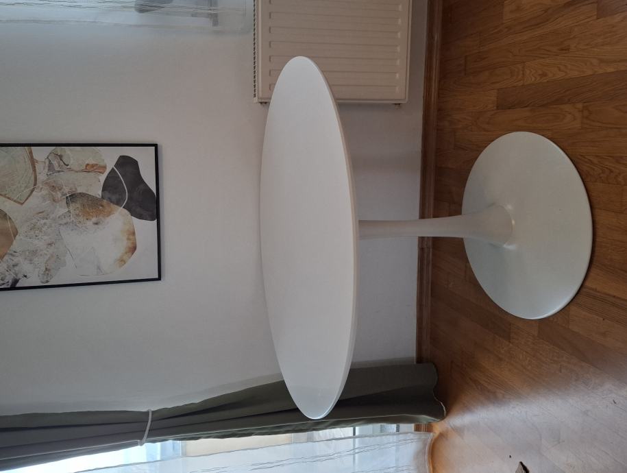 Prodajem blagovaonski stol RINGSTED (bez oštečenja) okruglog oblika promjera 100 cm u bijeloj boji. Stol ima jednostavan i moderan dizajn s glatkom pločom i stabilnom centralnom nogom. Pogodan je za manje blagovaonice ili kuhinje gdje može ugostiti 3-4 osobe.