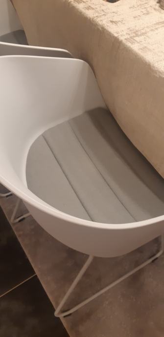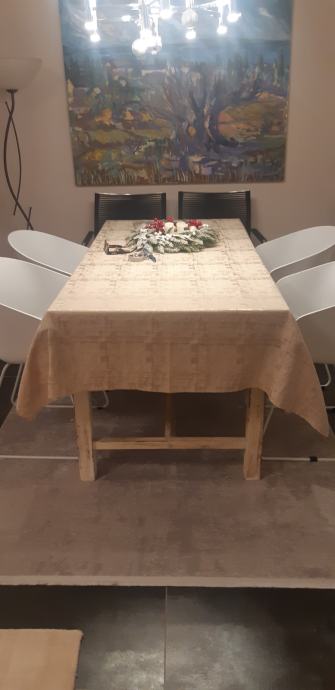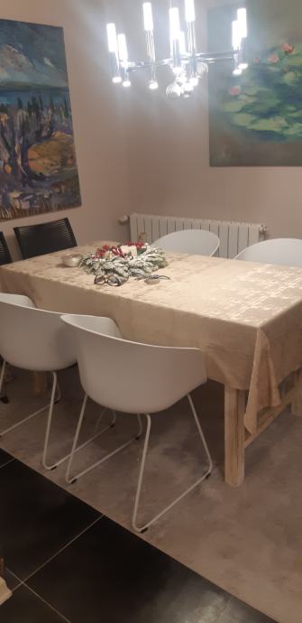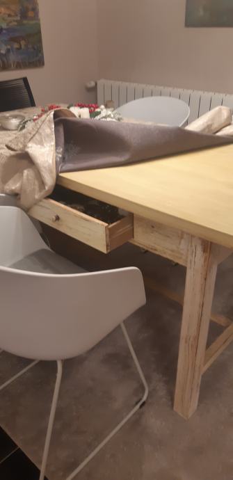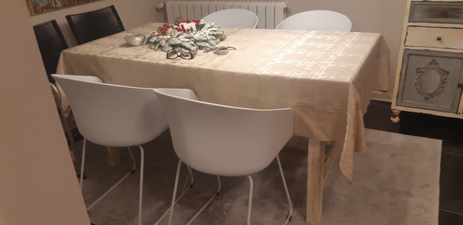 Blagovaonski stol od drva 160 x 80 prljavo bijele boje i četiri stolice . Tapacirung u sivoj boji.