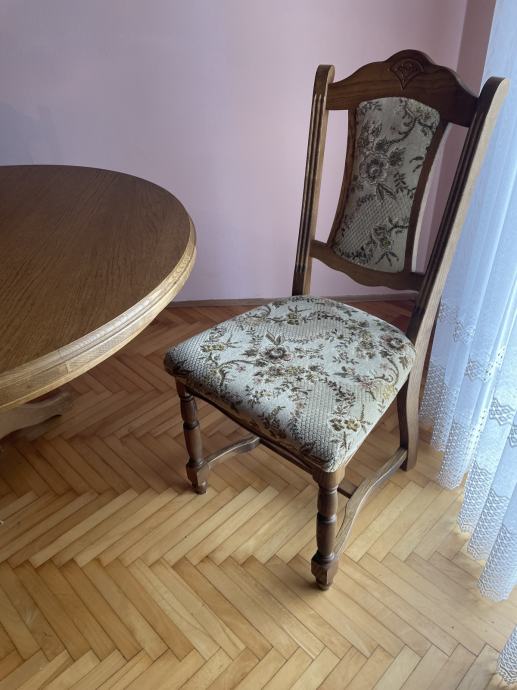 Stolice (6 kom.) čvrste i udobne od masivnog slavonskog hrasta u kombinaciji sa tapeciranim sjedalom u tkanini.