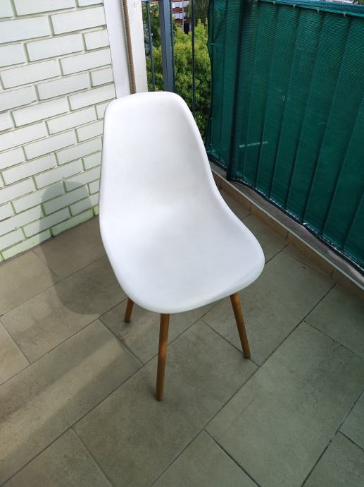 Blagovaonski stolci netapecirani, bijela plastika i drvene noge.