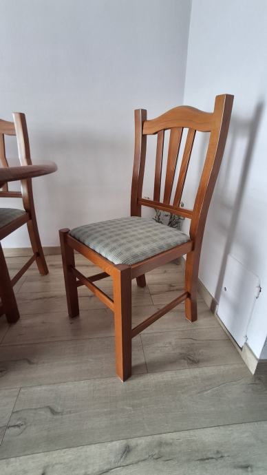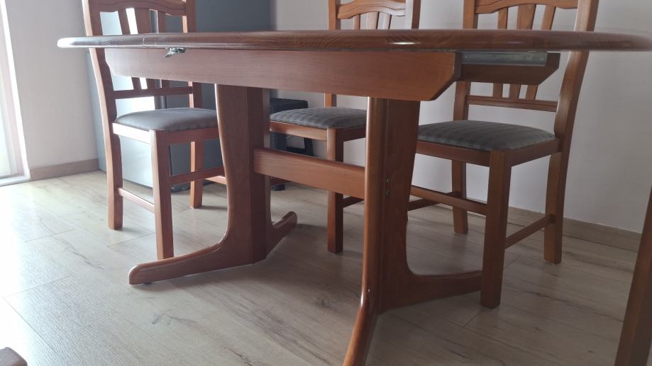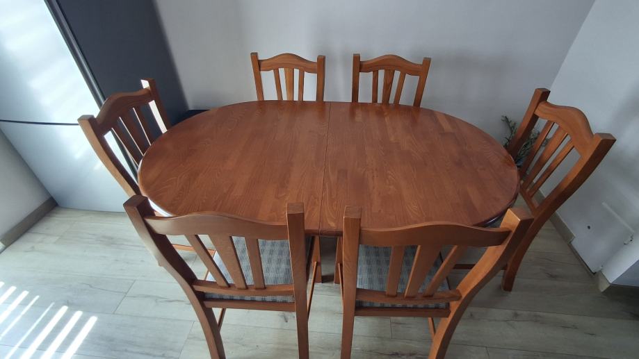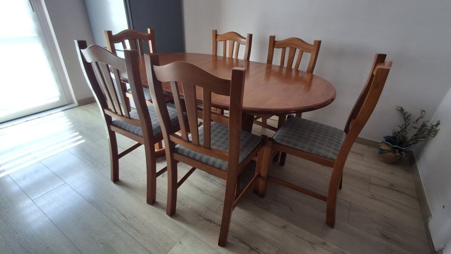 Blagovaonski stol rasklopivi, d: 160/200/240 cm; š: 100 cm; v: 76 cm. 6 drvenih stolica s tapeciranim sjedištem. Stol i stolice od punog drveta, čvrsto, u odličnom stanju...