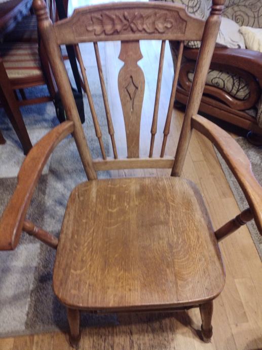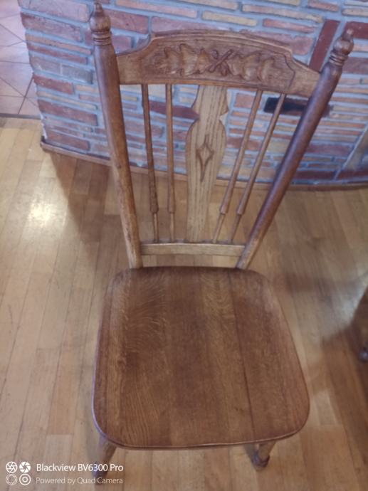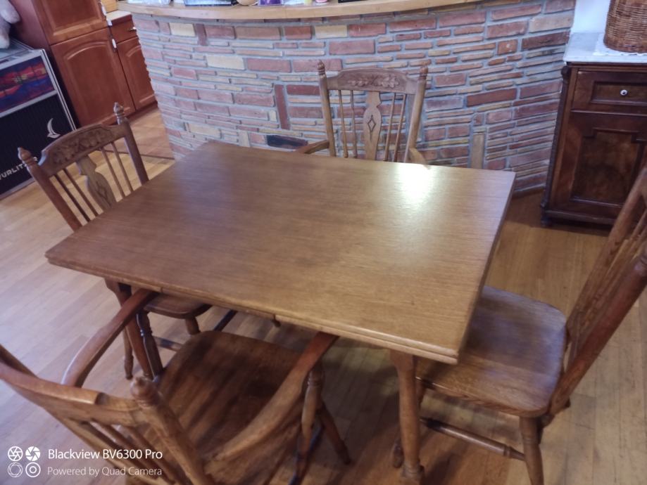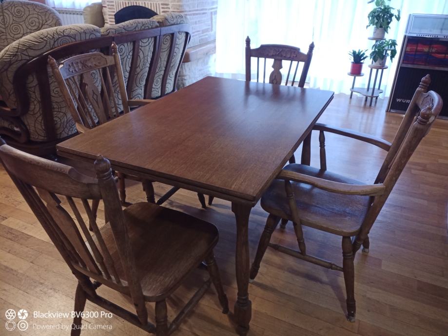 Blagovaonski stol i 6 stolica od hrasta, puno drvo, očuvano. Mjere 120x80, može se proširiti na 163 jednostrano ili 206 obostrano.
