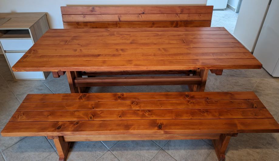 Prodaje se garnitura od masivnog drva sa dvije klupe (sa naslonom i bez naslona) i stolom. Čvrste je i kvalitetne izrade. Garnituru smo kupili novu i gotovo da nije korištena.