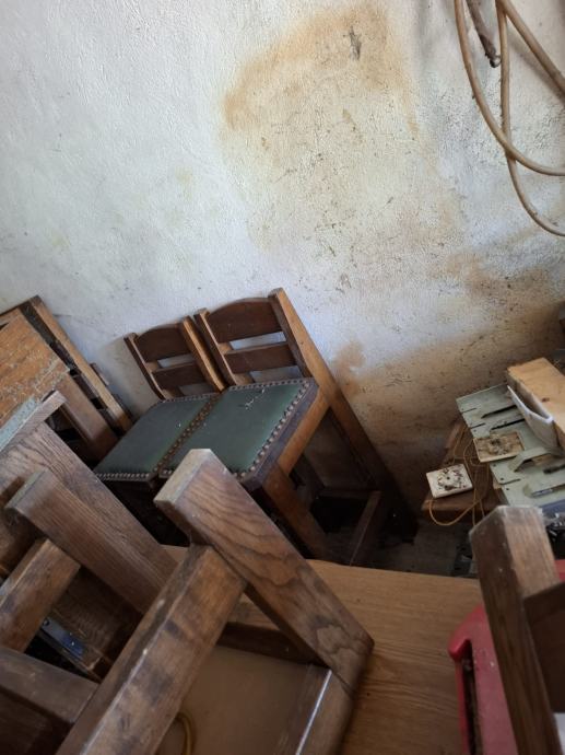 Stolovi, stolice, vrata i hrastove grede.