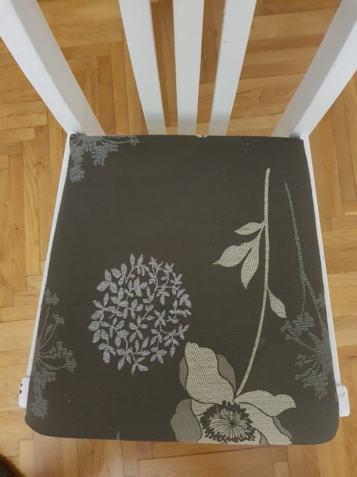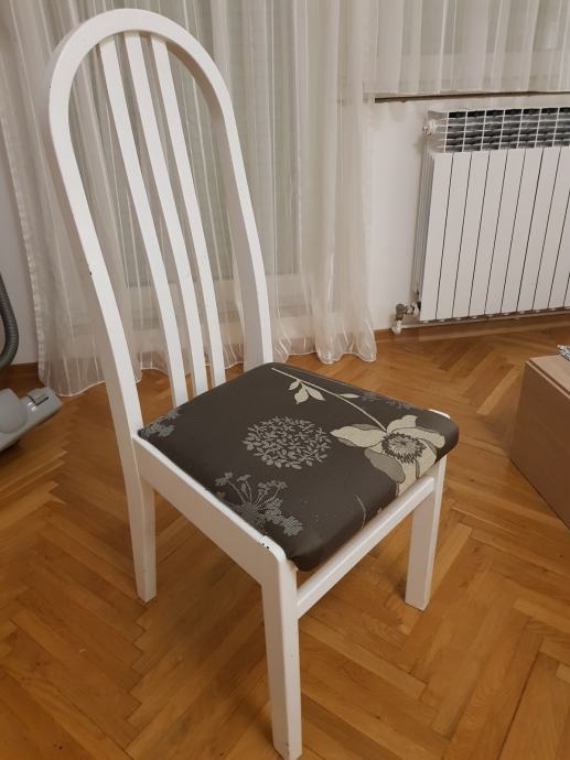 6 komada drvenih stolica. Presvucene su novim navlakama. Bile su crne, farbane u bijelo. Trebalo bi ih malo osvjeziti bojom. Inace nemaju nekih ostecenja. Komplet je 200 kn