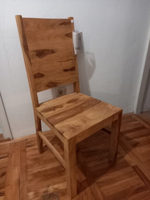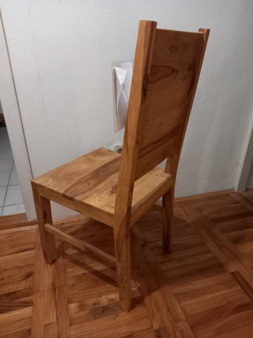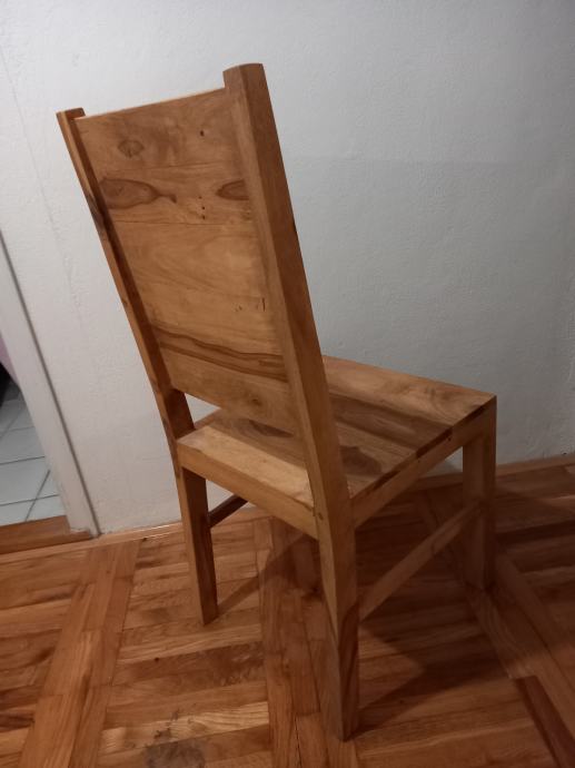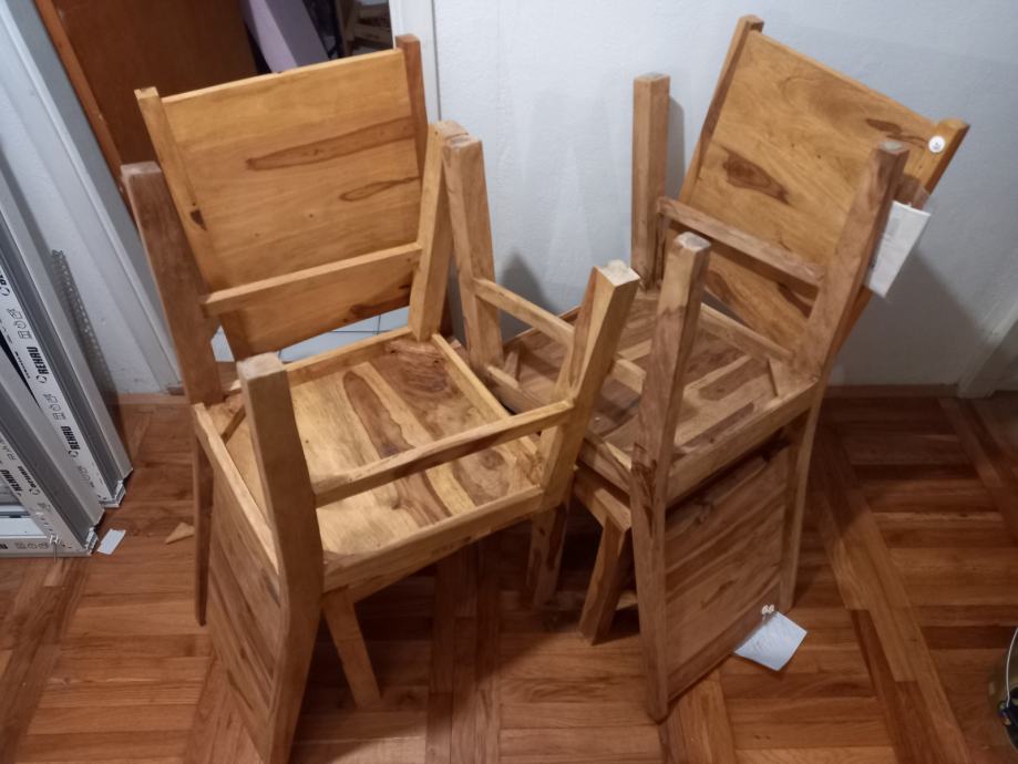 Nove stolice, nikad korištene, izrađene od masivnog drva. Ukupno 4 komada, cijena 35 Eura/stolica. Prodajem isključivo sve zajedno za 140 Eura.