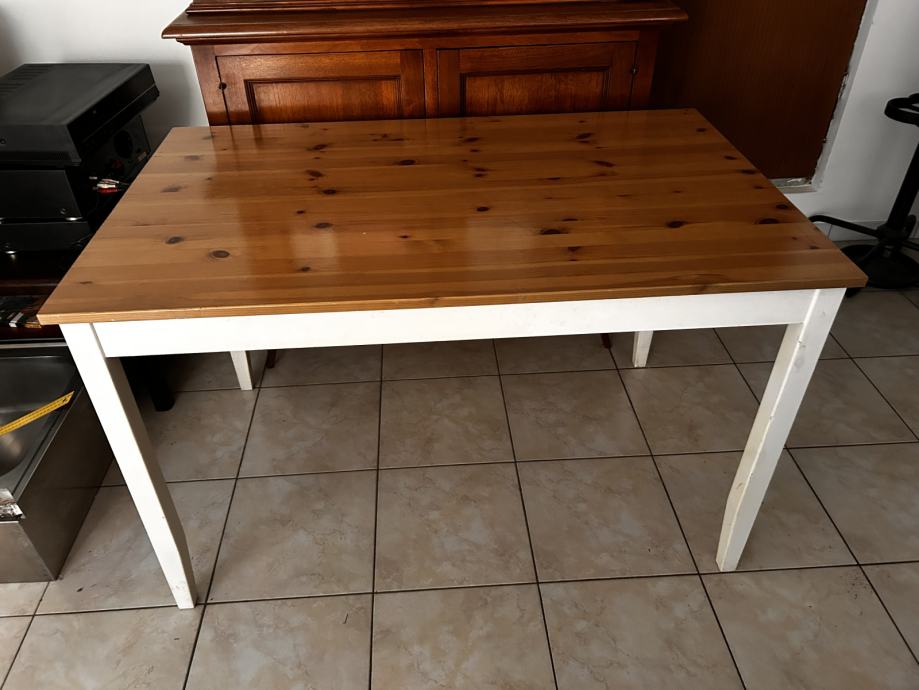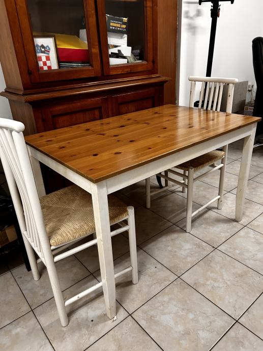 Očuvan drveni stol kupljen u Ikei. Bijele noge i ploča svijetli hrast lakirana. Stol je dobro očuvan. U kompletu su i dvije drvene stolice sa bijelim lakiranim nogama i naslonom. Sjedalica je od bambusovih niti.