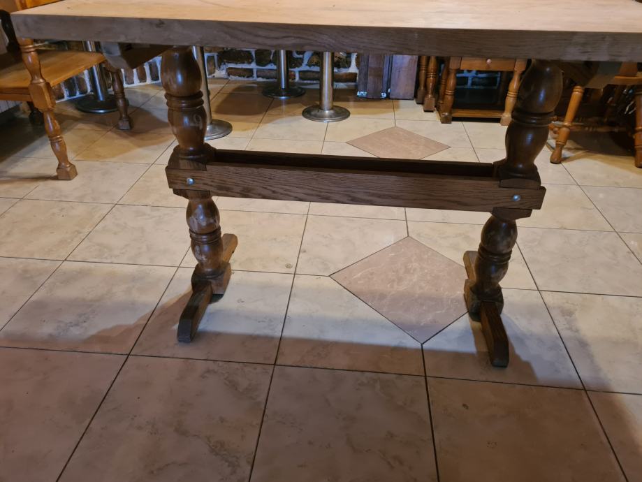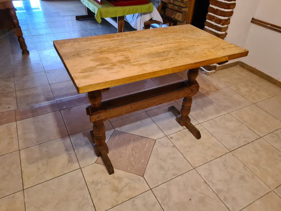 Prodajem drveni stol sa slike, potrebna restauracija. Puno drvo, kombinacija oraha i hrastovine, ručni rad. Dimenzije 117x65x84 cm.