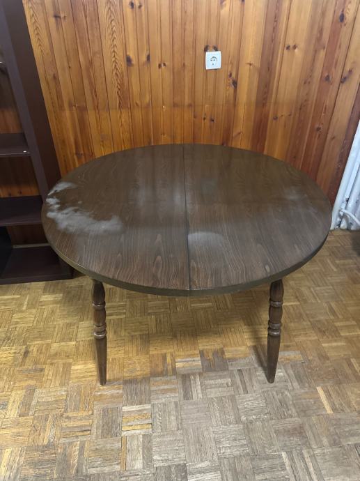 Prodajem drveni stol okruglog oblika s klasičnim tokarenim nogama. Stol je tamnijeg tona drveta i pogodan za blagovaonicu ili dnevni boravak. Stabilan i funkcionalan komad namještaja koji će dobro doći u svakom domu.