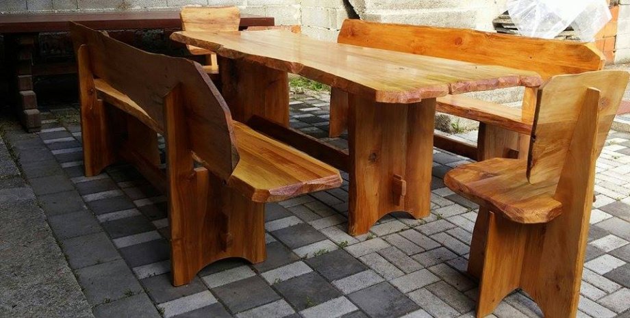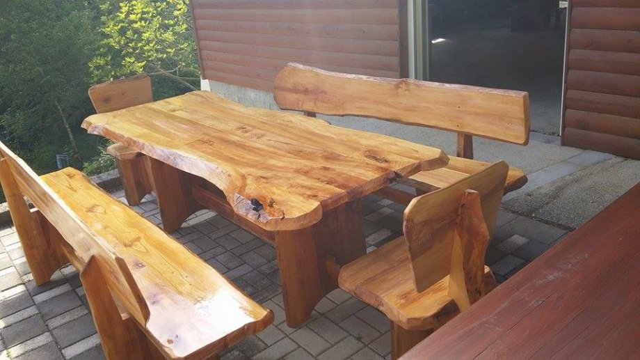 Garnitura se sastoji od stola,dvije klupe i dvije stolice.
