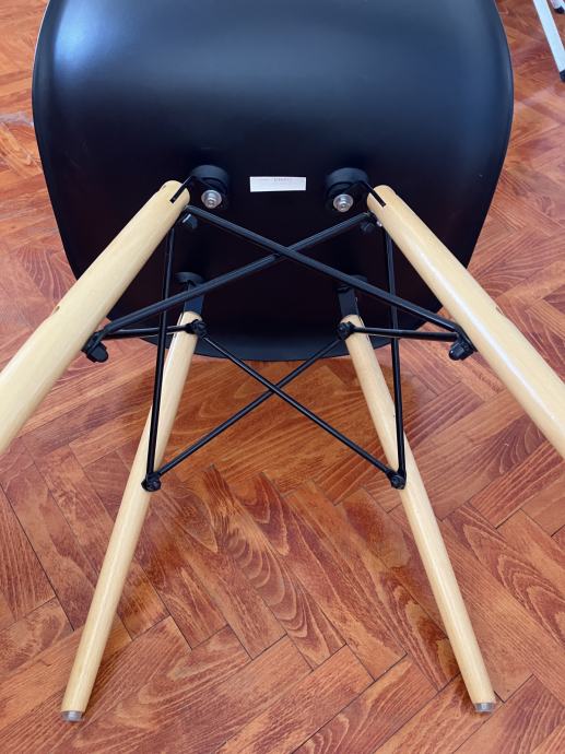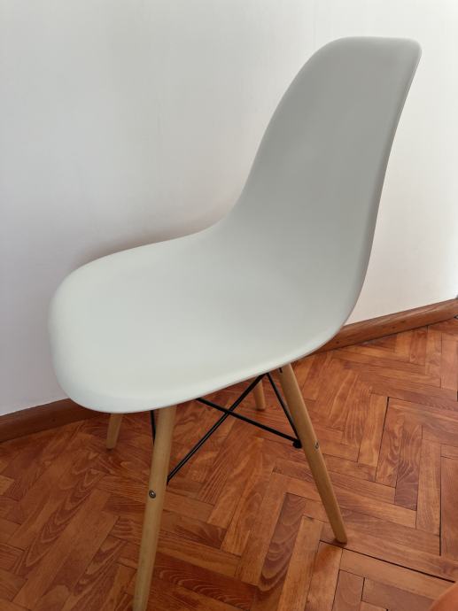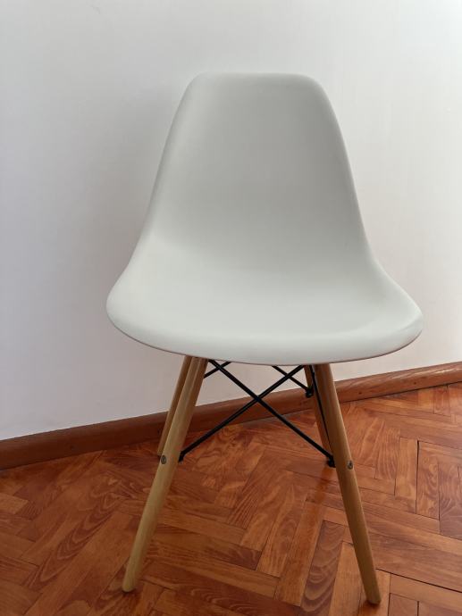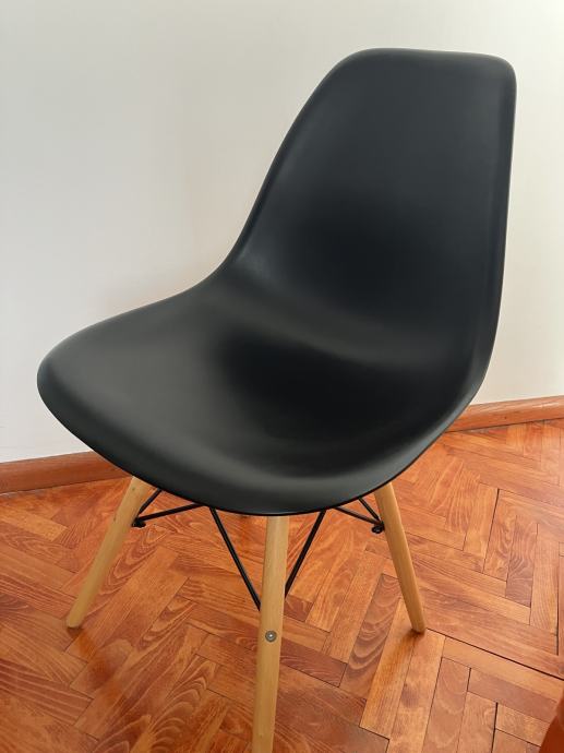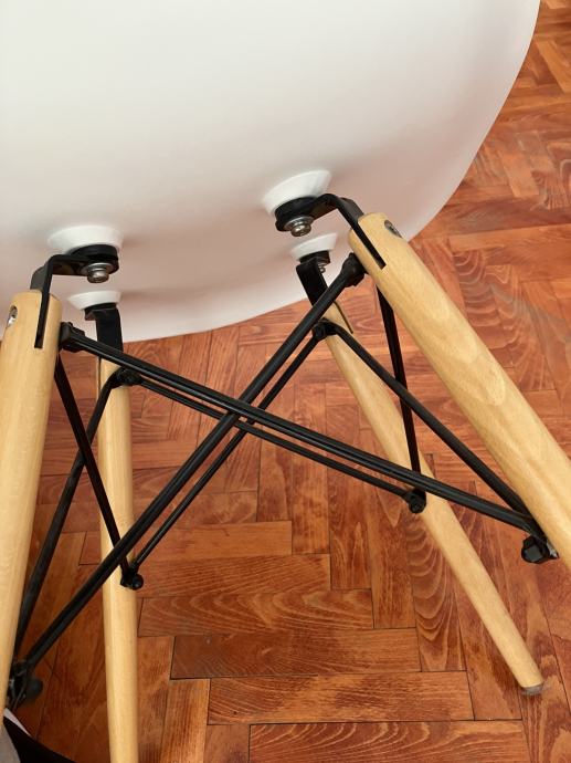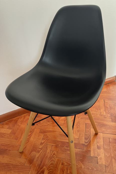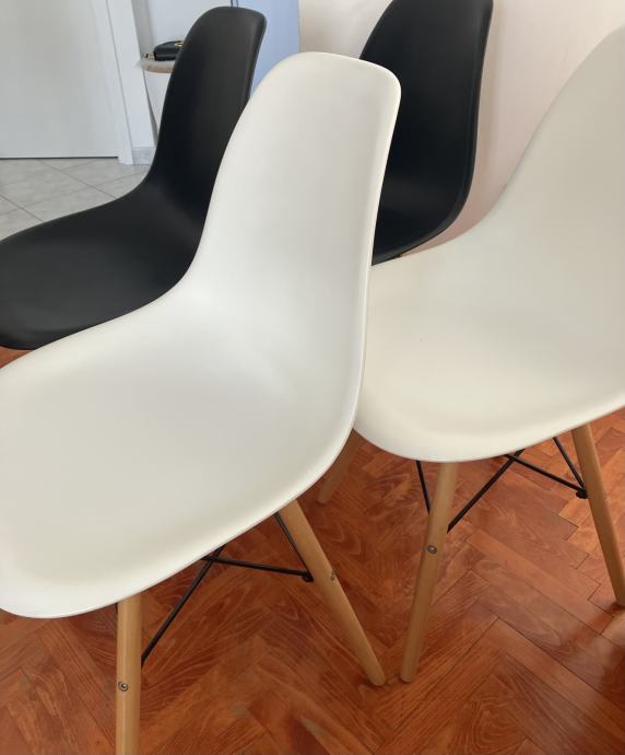 Prodajem 4 stolice u Eames stilu – 2 bijele i 2 crne, plastična školjka i drvene noge s metalnim ojačanjima. Udobne, stabilne i funkcionalne.