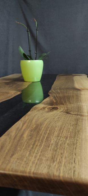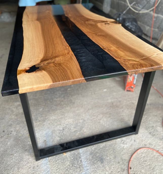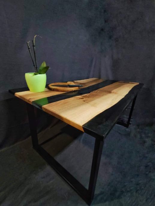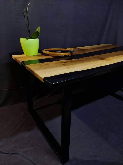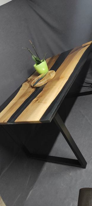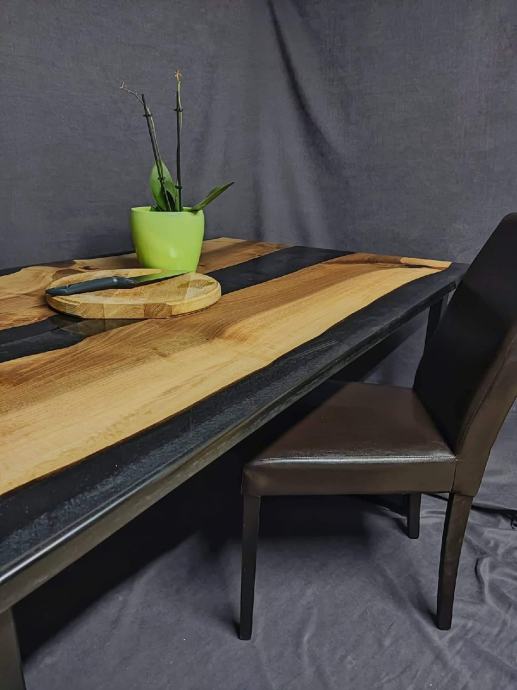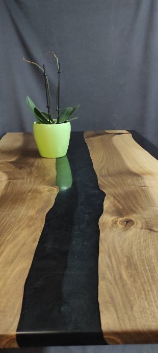 Unikatan trpezarijski stol rađen od pazljivo biranog drveta oraha u kombinaciji sa epoksi smolom. Zavrsni premaz rađen sa Woca uljem koje posjeduje certifikat za sigurnost u kontaktu sa hranom.