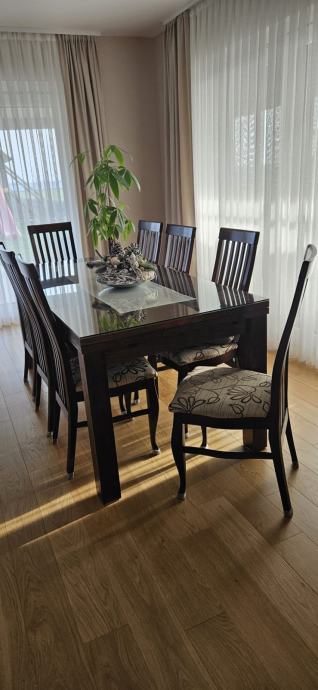 Prodajem hrastov stol na razvlačenje (8+4),boja orah. Uz stol ide 8 stolica i zaštitno staklo.