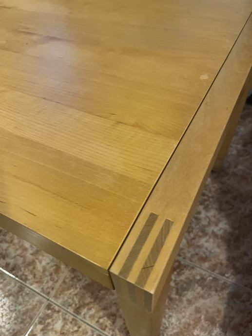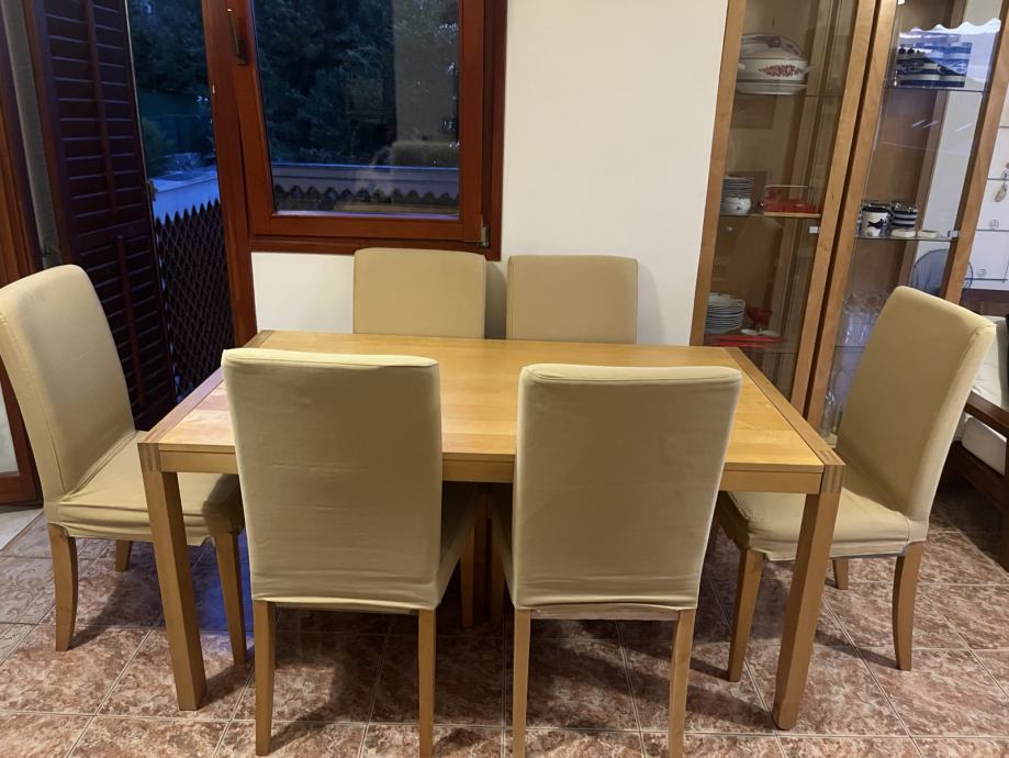 Drveni stol na razvlačenje sa šest stolica. Jako uscuvano. Rezervne plave presvlake za sve stolce. Nigdje oštećen, jako uscuvan.