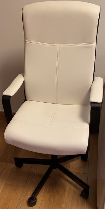 Bijela uredska stolica sa zaobljenim linijama, pažnjom na ušivenim detaljima i skrivenim mehanizmom koji se lako koristi ispod sjedala.