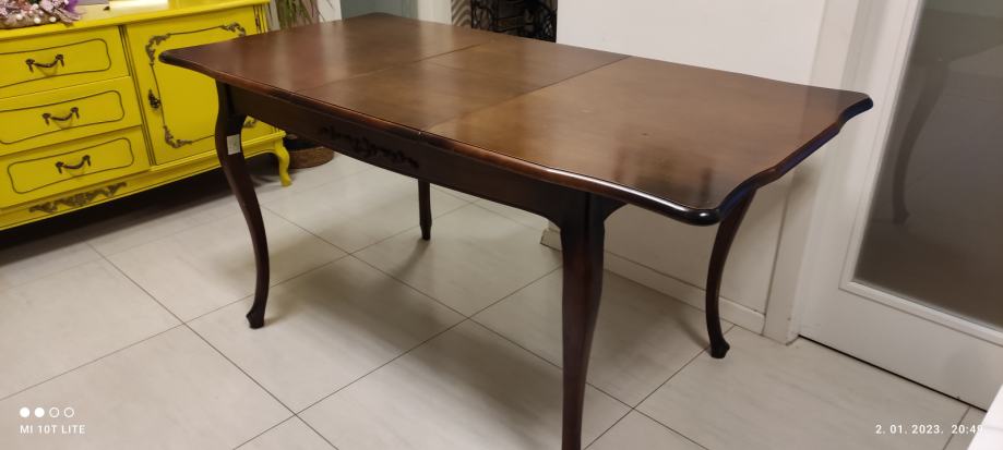 STOL ZA BLAGOVAONU NA RAZVLAČENJE-RUSTIKA Namještaj je proizveden sedamsetih godina p.s. u stilu RUSTIKA u tvornici koja je tada bila poznata po proizvodnji lijepog i kvalitetnog namještaja, adekvatno tomu i visokoj cijeni proizvoda. Stol se nalazio unutar popisa predmeta sa kojim su se opremali ondašnji komforni luksuzni stanovi. Vlasnik ,te obitelj koja je živjela u tako uređenom prostoru su se sa velikim obzirom odnosili prema svakom dijelu namještaja, pa je tako i ovaj stol doživio puno godina služeči toj obitelji u ovako izvrsnom stanju i očuvanosti.Pored toga ne samo pažnja ukućana, nego i kvaliteta samog proizvoda je pridonjela da i danas izgleda kao nov.Dimenzije su bile također prilagođene osobama koje če sjediti za stolom , uživati u ponuđenoj hrani , te časkanju sa ostalim prisutnim osobama neopterećenI njihovom blizinom . STOL JE ČETVRTASTOG OBLIKA ,NA RAZVLAČENJE SLJEDEĆIH DIMENZIJA
