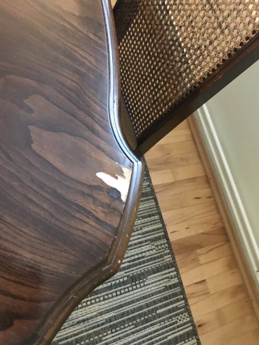Stol je oštečen na forniru bukva, stolice neznatno i sve je vidljivo na slikama dok popravak ne zahtjeva veće stolarske intervencije. Proizvedeno prije 35 godina u Novom Mestu još kad se namještaj radio kvalitetno, a na drvu se nije štedjelo.