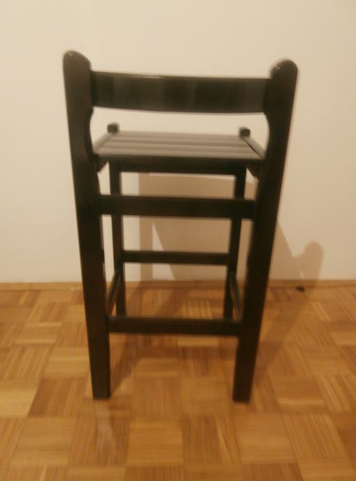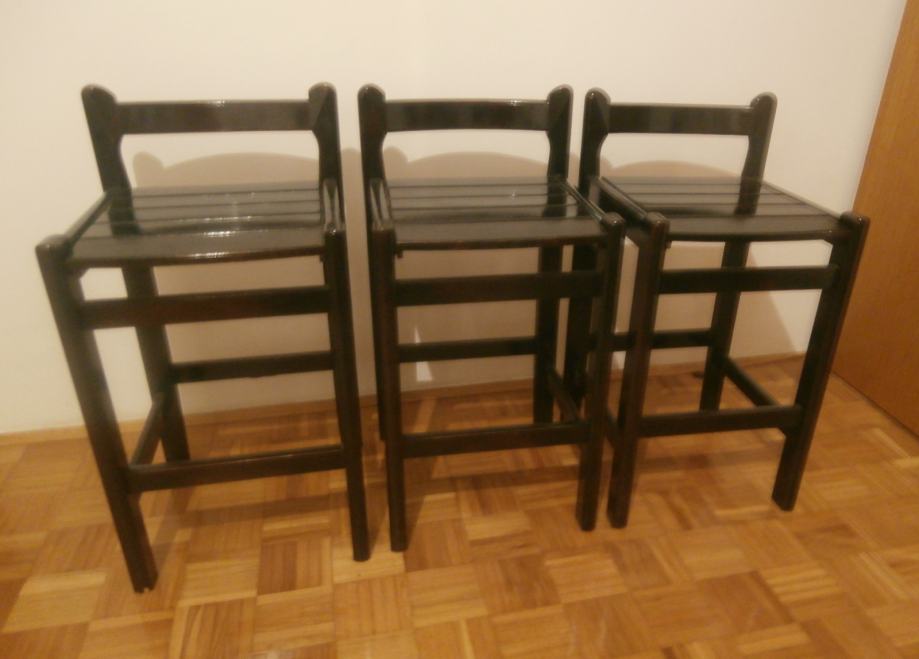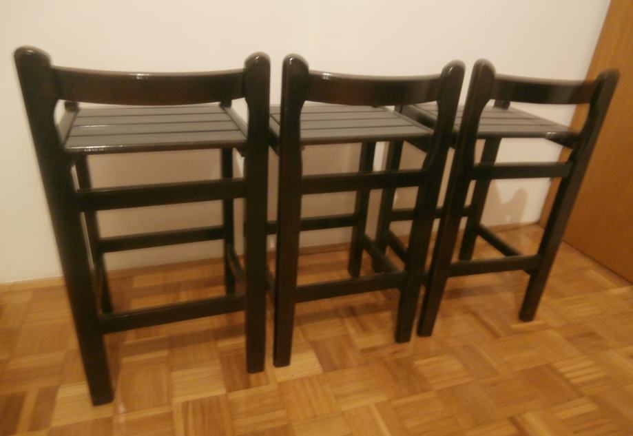 Prodajem 3 barske stolice od masivnog drveta (visina 76, širina 38, dubina 38 cm), konstrukcija vrhunske kvalitete, malo korištene, čvrste, odlično stanje, idealne su za male prostore i apartmane, preuzimanje u Splitu