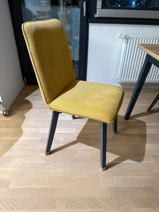 Prodajem komplet od 6 blagovaonskih stolaca u dobrom stanju. Noge su drvene, sive boje. Sjedište je žuto. Širina sjedišta je 48 cm, dubina sjedišta 44 cm, visina naslona 47 cm. Prodaju se samo u kompletu.