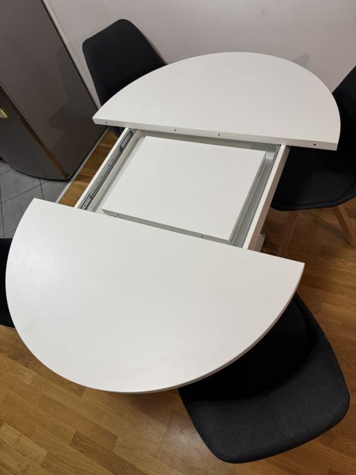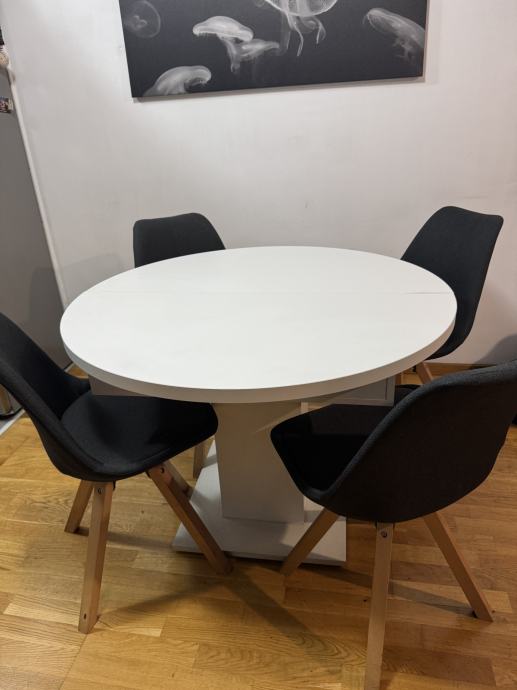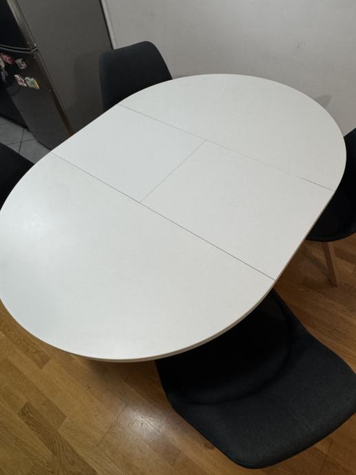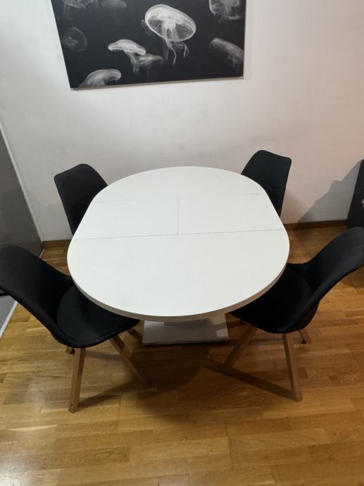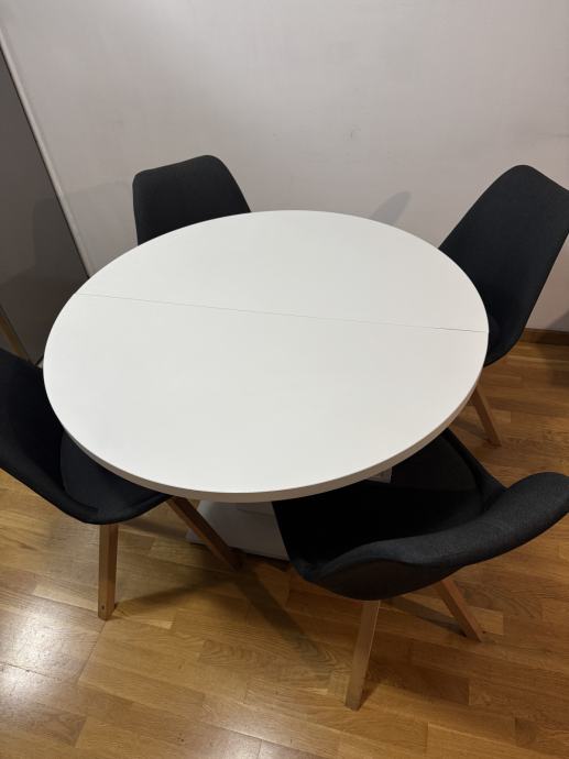 Prodajemo okrugli stol na razvlačenje i 4 stolice. Stol je promjera 105 cm (razvučen 145 x 105 cm).