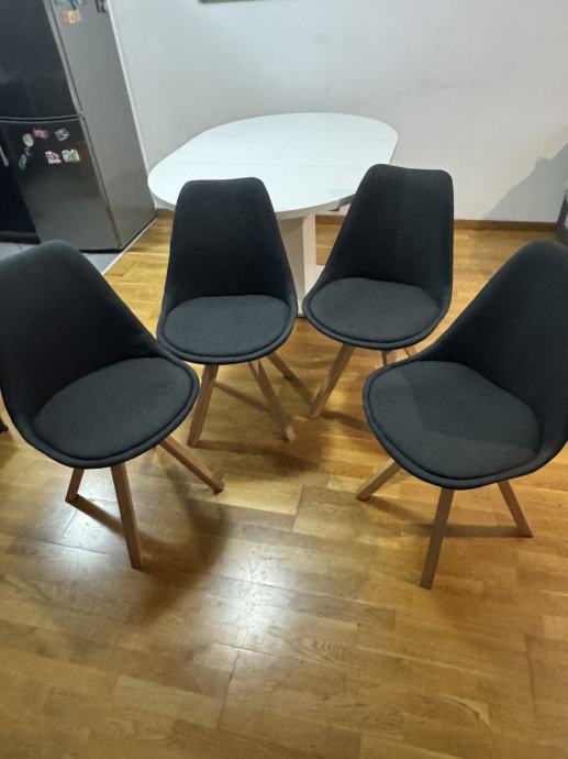 Stol je bijele i stolice su tamno sive boje. Cijeli komplet je star 4 godine i u relativnom dobrom je stanju. Nije puno korišteno i nalazi se u nepušačkom kućanstvu.
