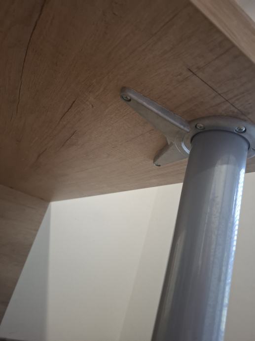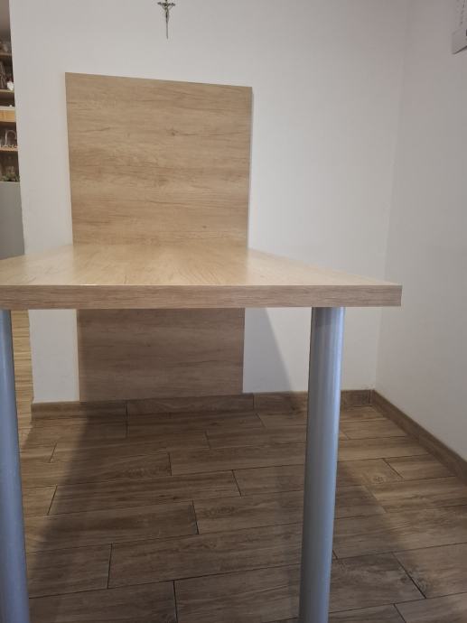 Prodajem kuhinjski odnosno blagovaonski stol u svijetloj drvenoj boji, dekora hrasta. Ploča stola izrađena je od iverice s folijom koja imitira drvo, a noge su metalne, srebrne boje. Stol je pravokutnog oblika i odgovara manjim kuhinjama ili blagovaonicama.