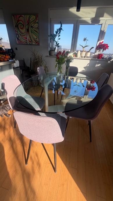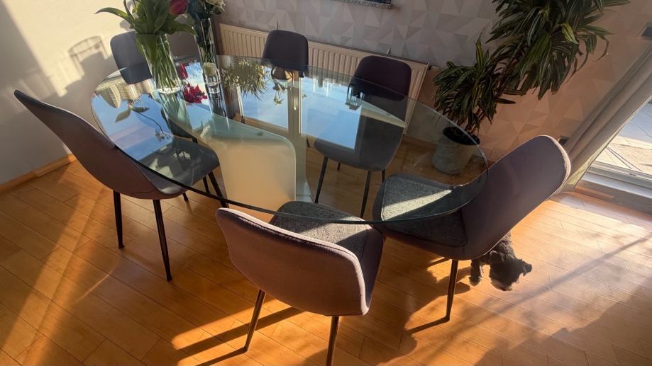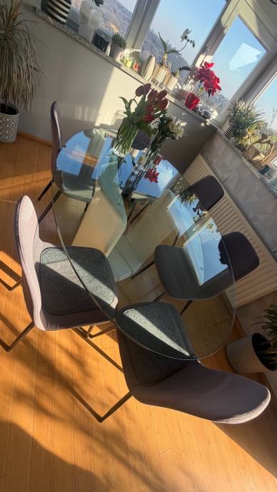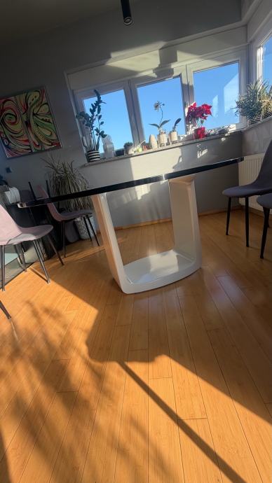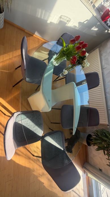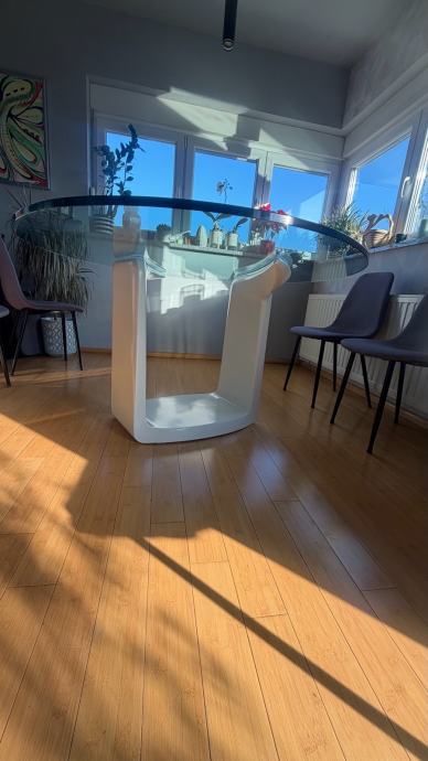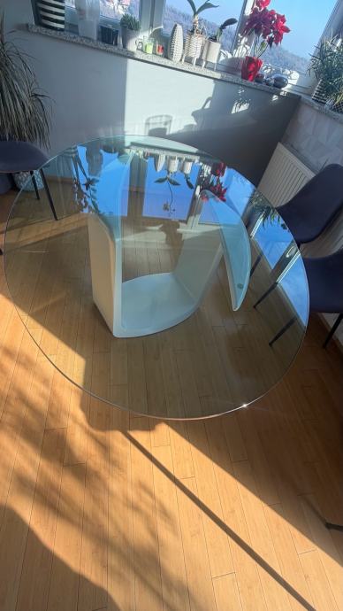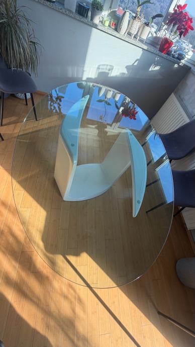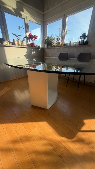 Prodajemo prekrasan ovalni stakleni kuhinjski stol ,stane 8 stolica oko njega, masivan i stabilan, dimenzija stakla je 180x120 cm, na bazi stola 2 manja oštećenja(vidljivo na fotografijama) koja se lako poprave jer je baza od medjapana.