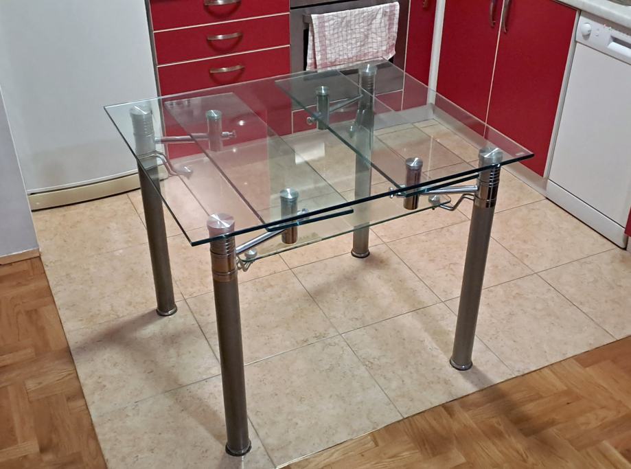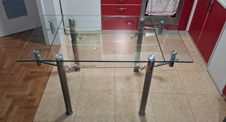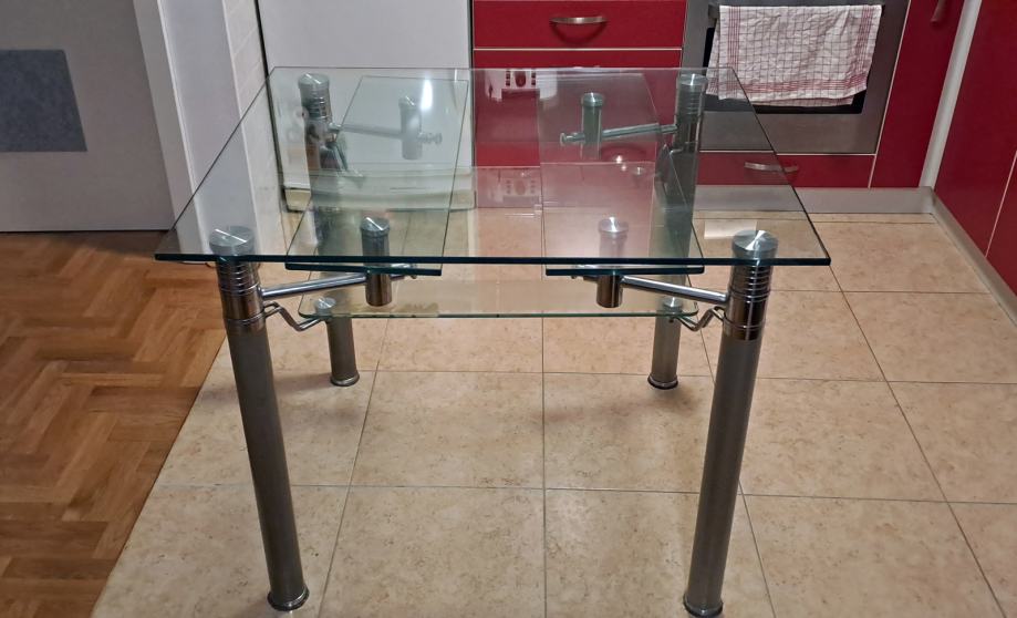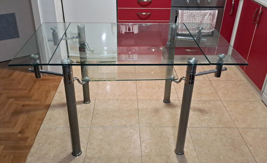 Rabljeni stakleni kuhinjski stol star cca 5+ godina sa dodatnom policom za novine te mogućnošću razvlačenja. Stol je 95x80cm dimenzija u skupljenom stanju te 140x95cm u razvučenom stanju. Visina stola je 76cm.