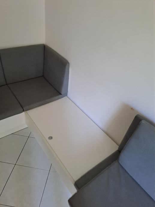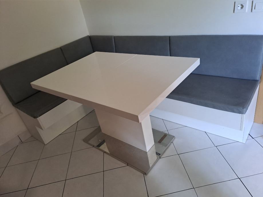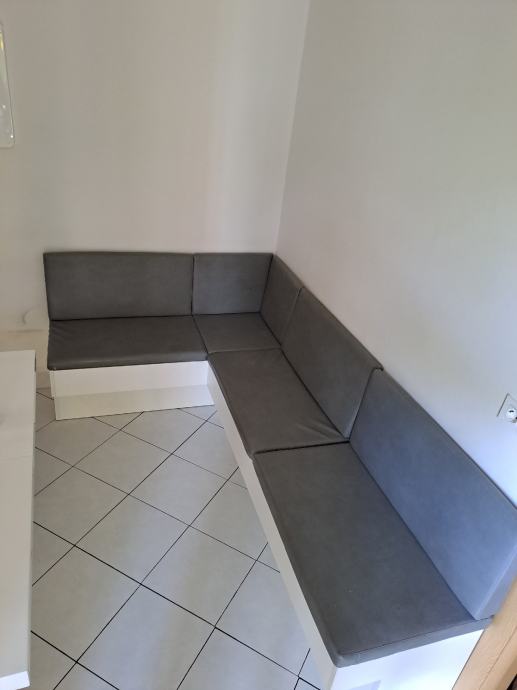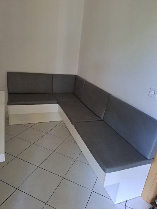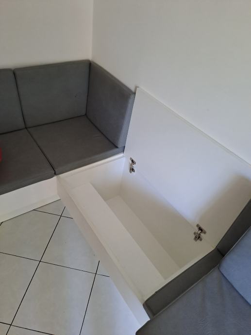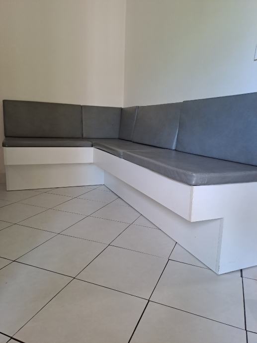 Kutna kuhinjska klupa dužina 1.30m x 1,60m sa sjedalicama i naslonima. Svaka klupa ima u sebi mjesto za pohranu stvari.