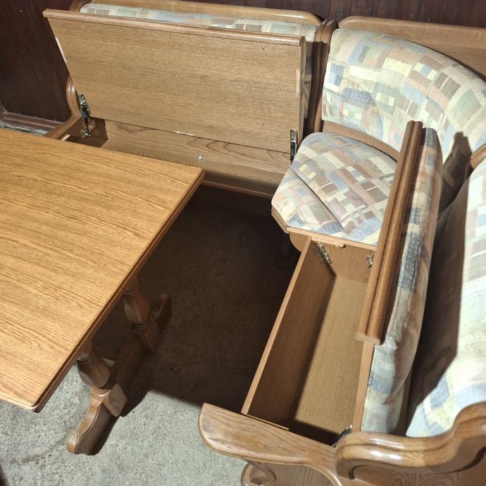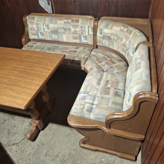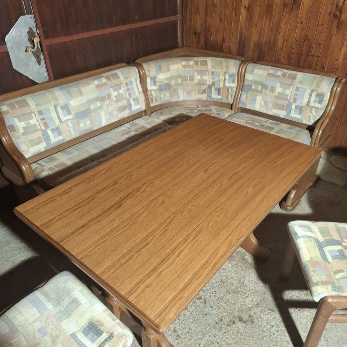 Blagovaonska garnitura od masivnog drva hrasta Njemačke proizvodnje. Koja uključuje stol na razvlačenje, pripadajuće stolice i kutnu klupu.Tradicionalni stil namještaja. Izrazito udobna kutna i stolice!!