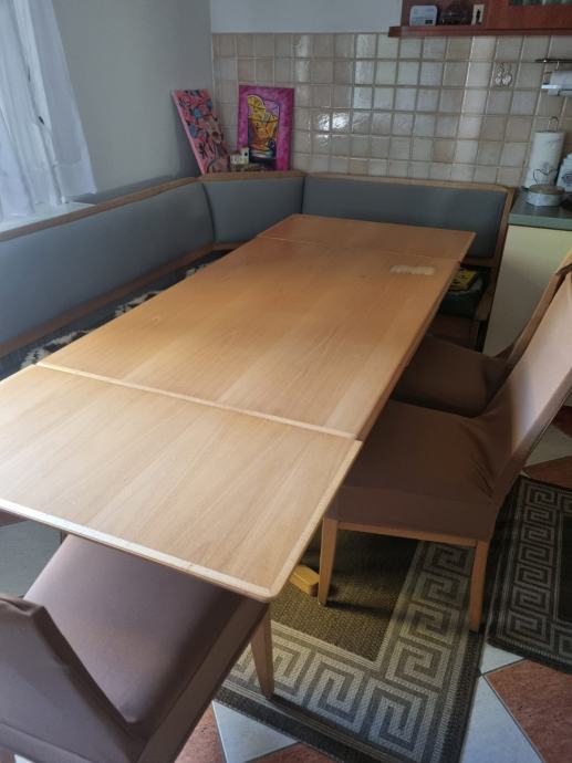Prodajem kuhinjski stol sa kutnim namještajem uz 3 stolice za sjedenje