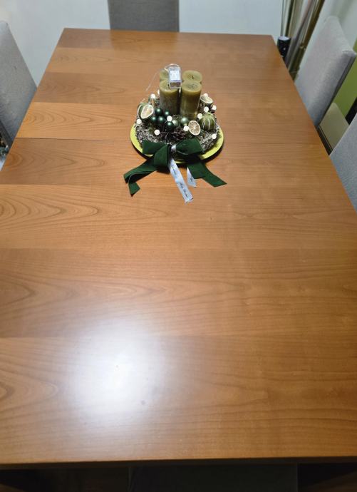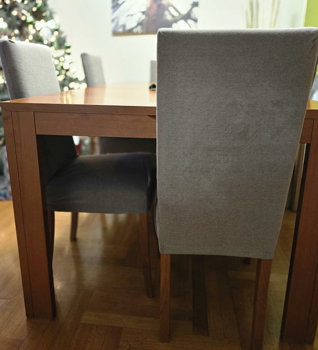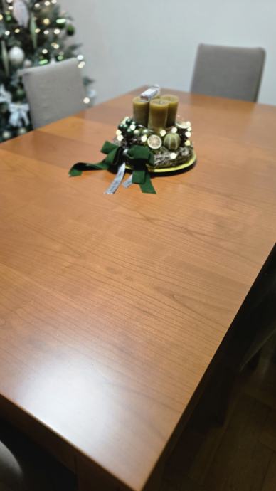 Prodajem kvalitetan masivan blagovaonski stol od punog drva (bukva) u toploj boji trešnje, zajedno sa 6 udobnih tapeciranih stolica.