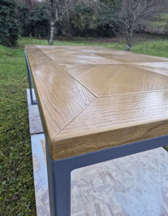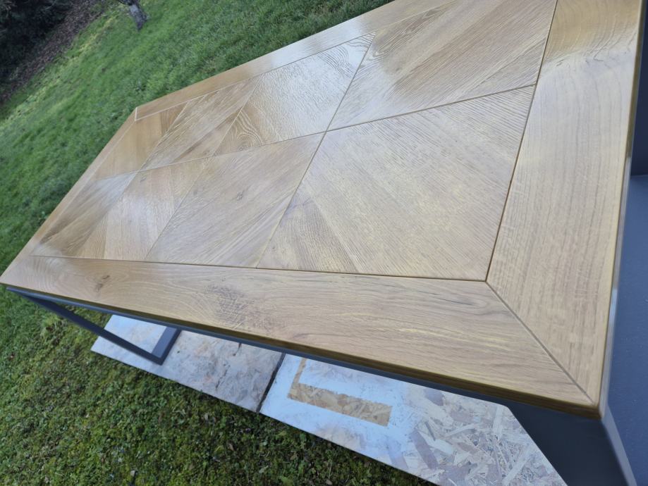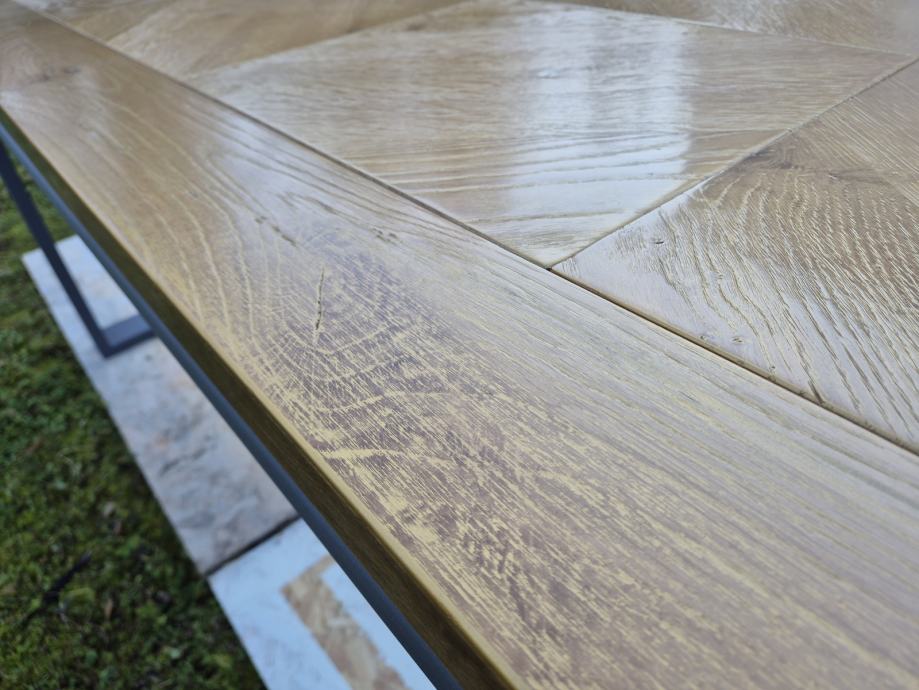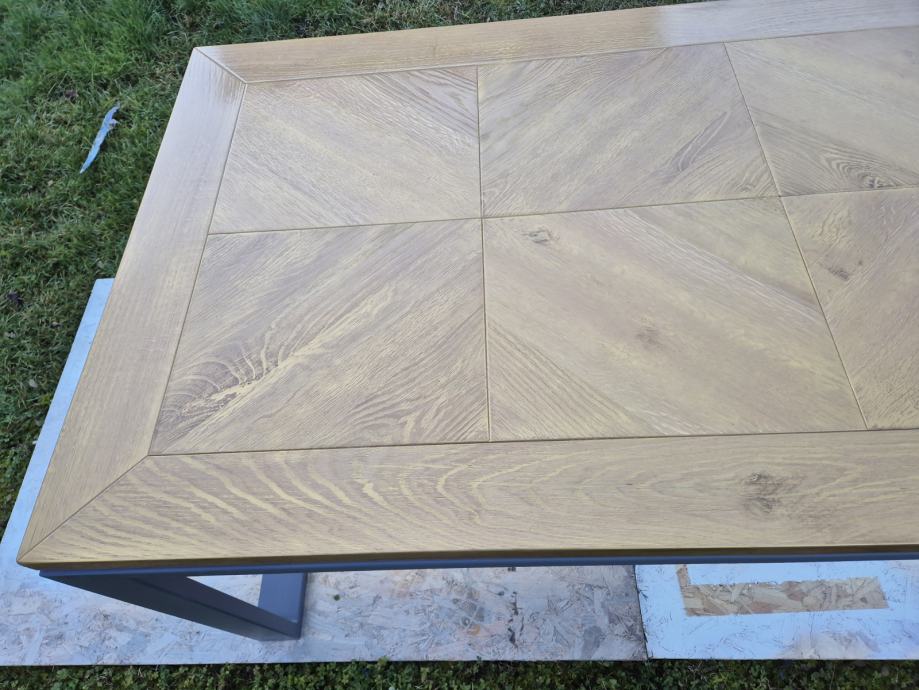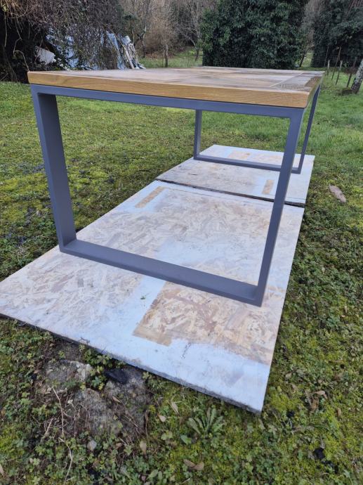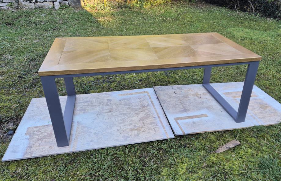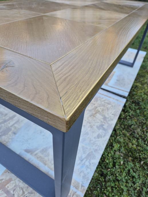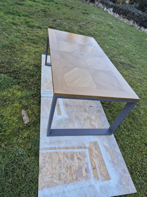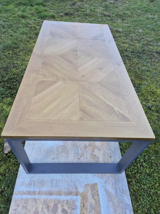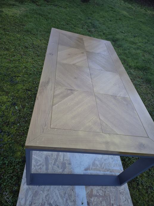 Konstrukcija je od pravoga drva hrastovih.. masiv..nije furnir..osmišljeno i napravljeno na način da imate iste debljine maduva i sa dolnje i sa gornje strane ploče da drvo bude čim stabilnije u vremenu..unikat primjerak..lakiran i predivan zlatni hrast.Ploca je postavljena na moderno postolje također rucni rad i lakirano je u jednu predivnu toplo svilenkadto pepel plavkastu sivu boju.
