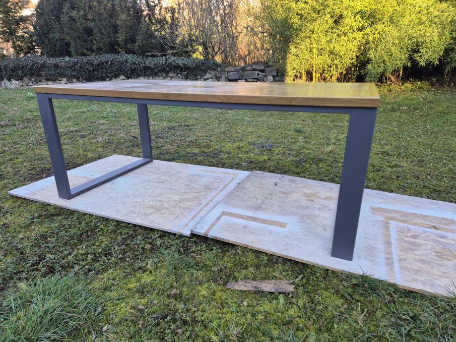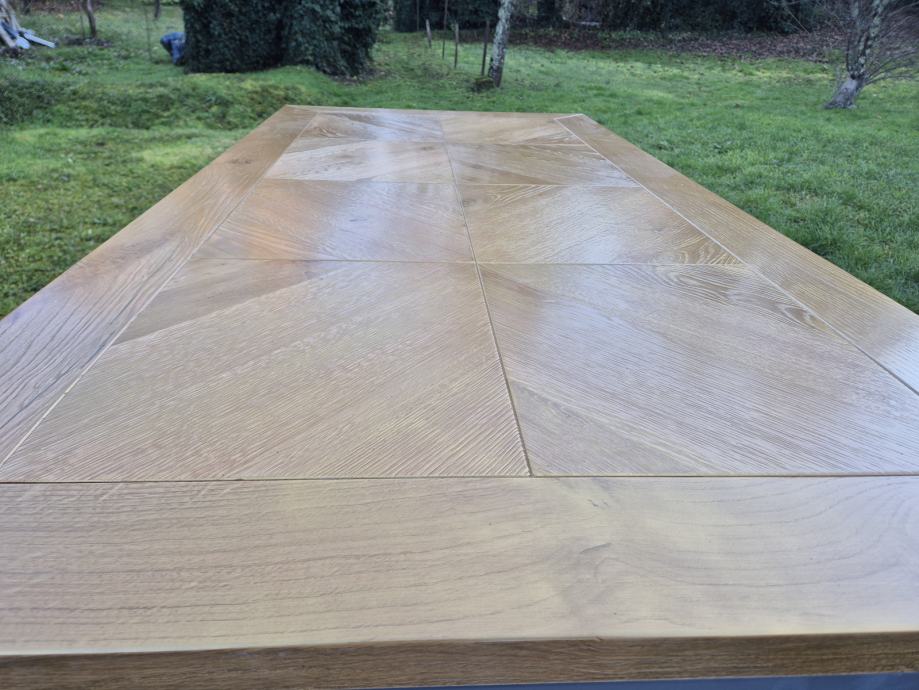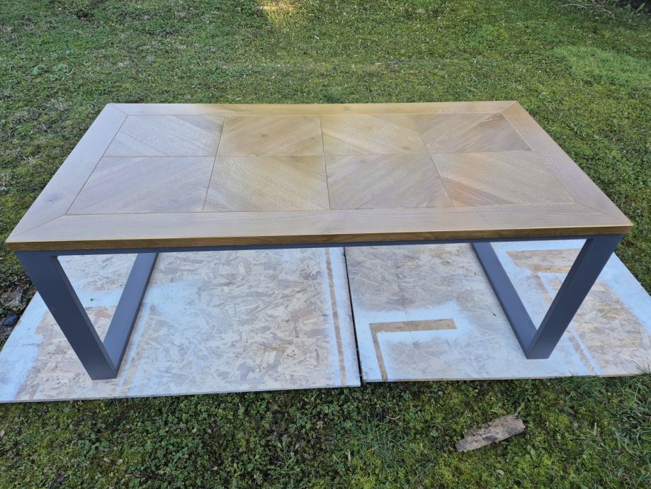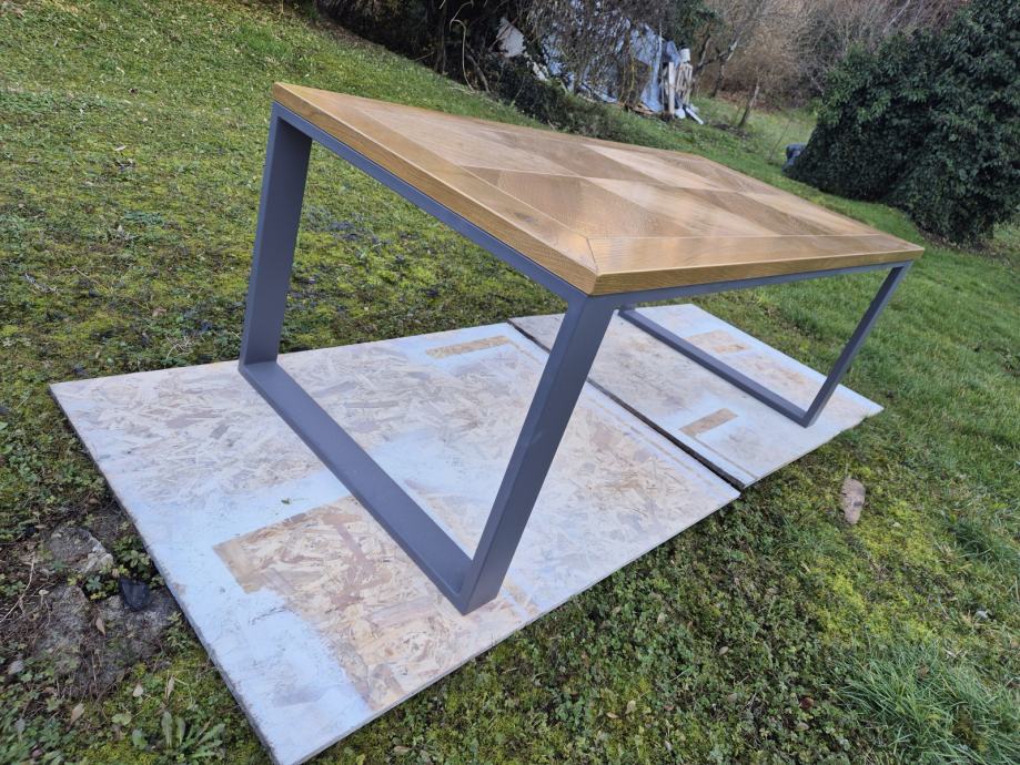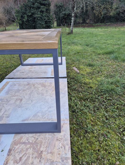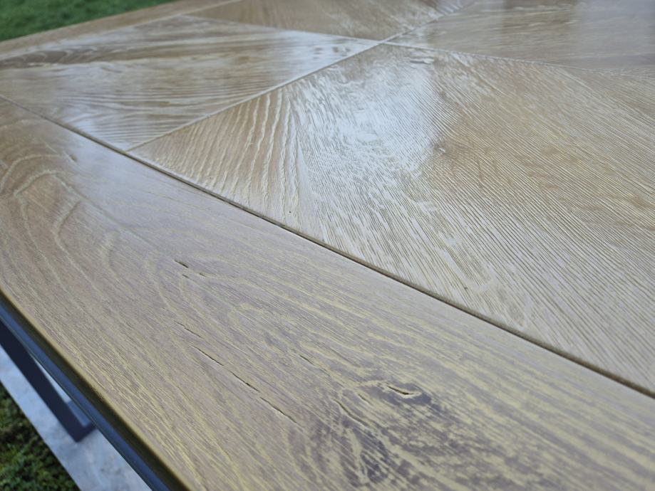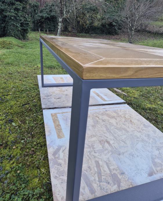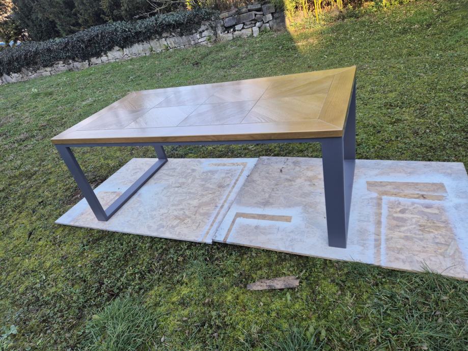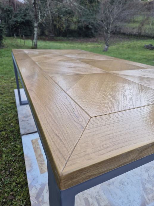 Konstrukcija je od pravoga drva hrastovih.. masiv..nije furnir..osmišljeno i napravljeno na način da imate iste debljine maduva i sa dolnje i sa gornje strane ploče da drvo bude čim stabilnije u vremenu..unikat primjerak..lakiran i predivan zlatni hrast.Ploca je postavljena na moderno postolje također rucni rad i lakirano je u jednu predivnu toplo svilenkadto pepel plavkastu sivu boju.