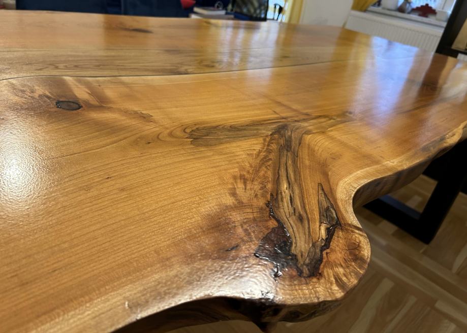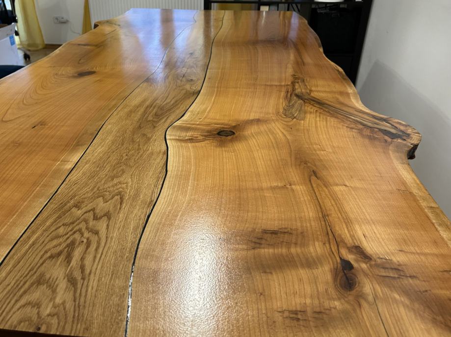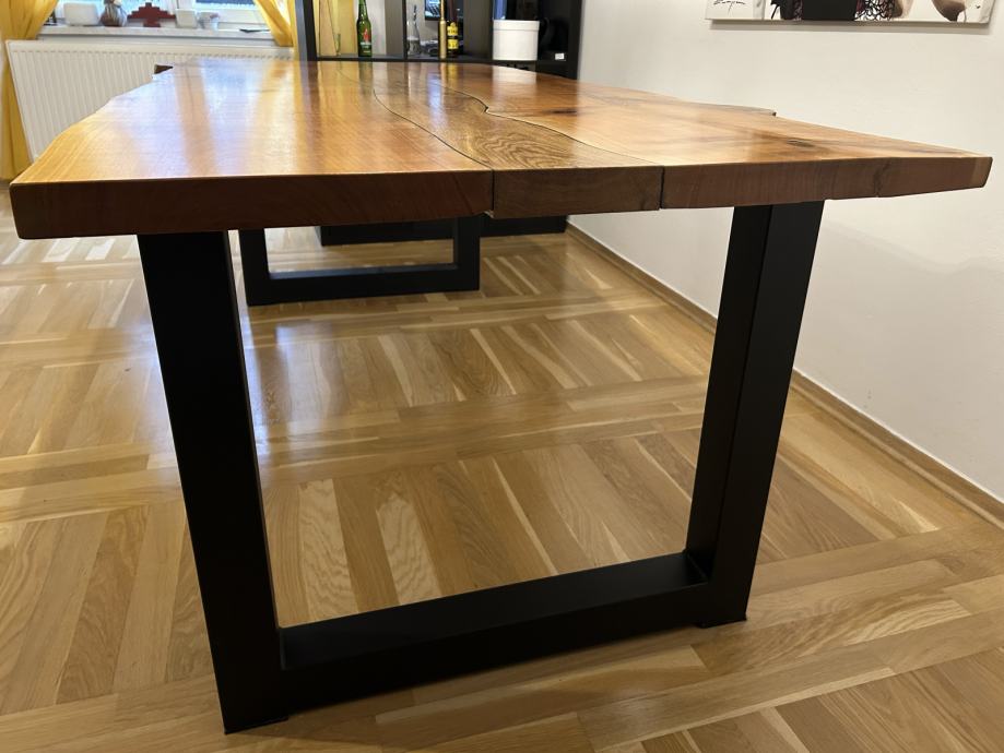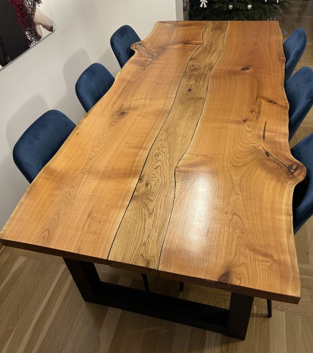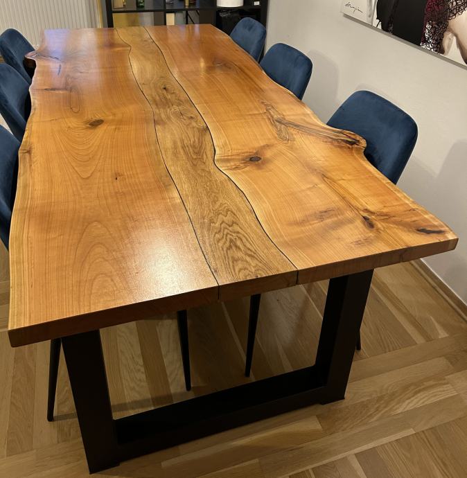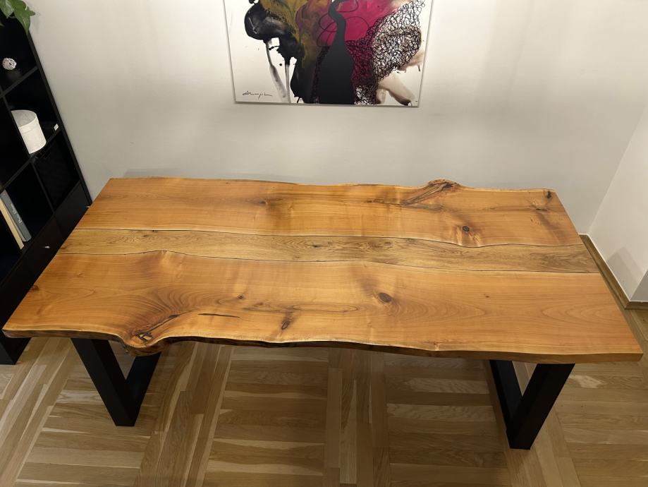 Jedinstveni ručno izrađeni stol od punog drveta – kombinacija trešnje i hrasta s metalnim nogama.