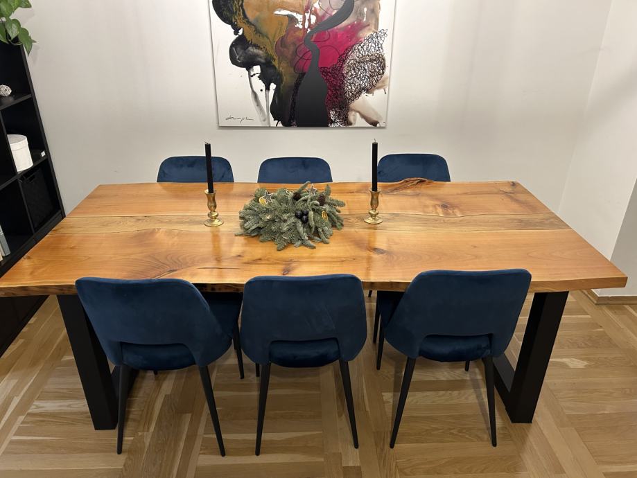 Ovaj unikatni stol savršen je za dnevni boravak ili blagovaonicu, a njegova kombinacija prirodnog drva i modernih metalnih nogu jamči dugotrajnost i stabilnost te donosi toplinu i eleganciju svakom prostoru.
