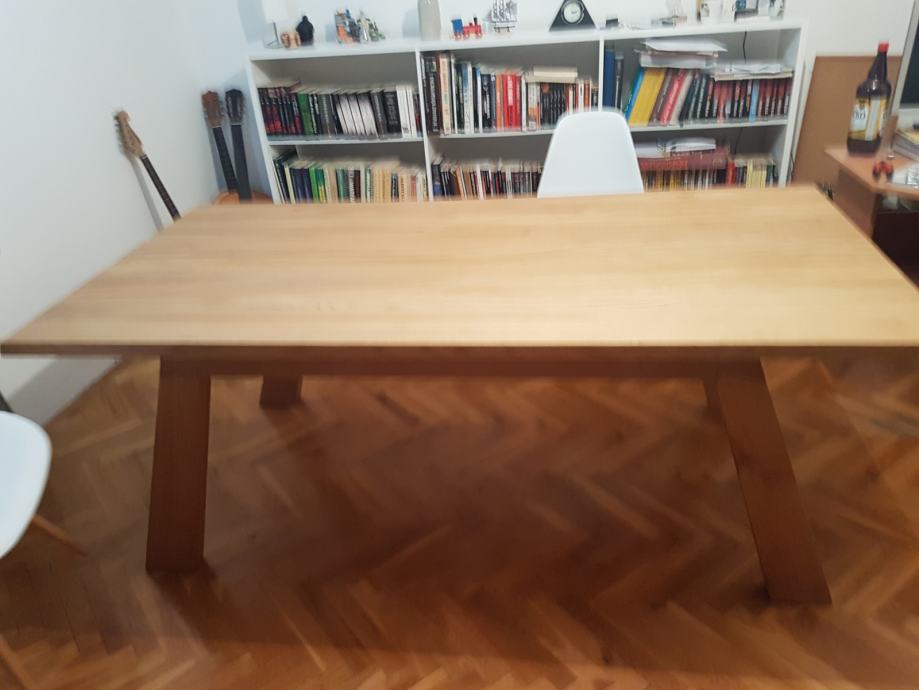 Prodajem masivni drveni stol kupljen prije godinu dana u Emmezeti. Stol se sastoji od masivne gornje ploče (cca. 60kg) te nogu. Dimenzije 1x2m. Uz stol idu i dvije stolice. Stol je izuzetno malo korišten te je dobro održavan. Preuzimanje moguće svaki dan nakon 17h na adresi (V. Mačeka, Tenja)