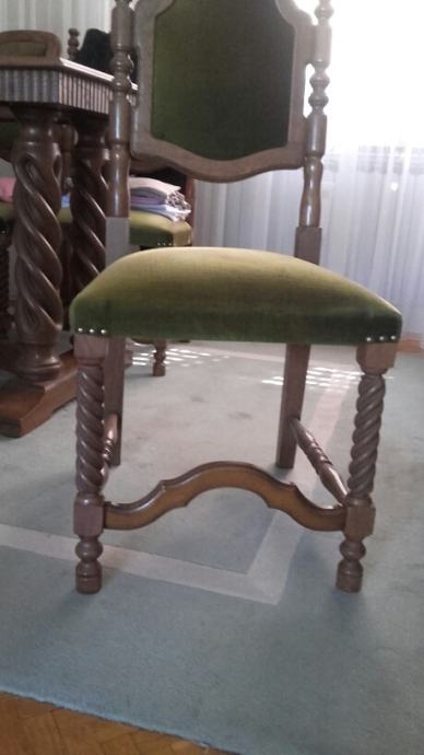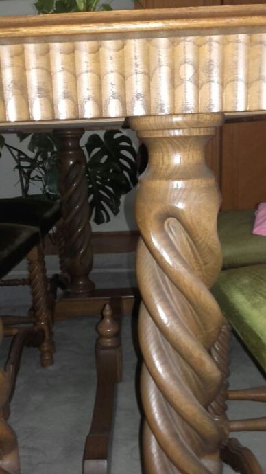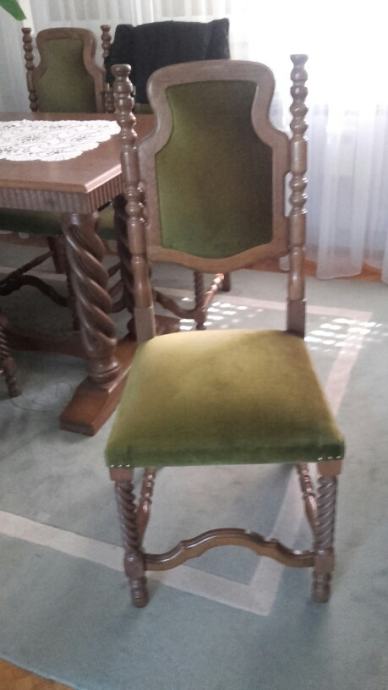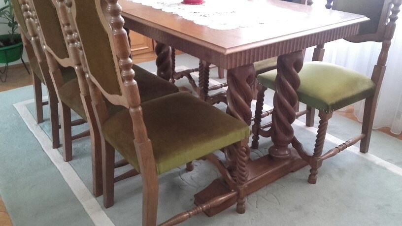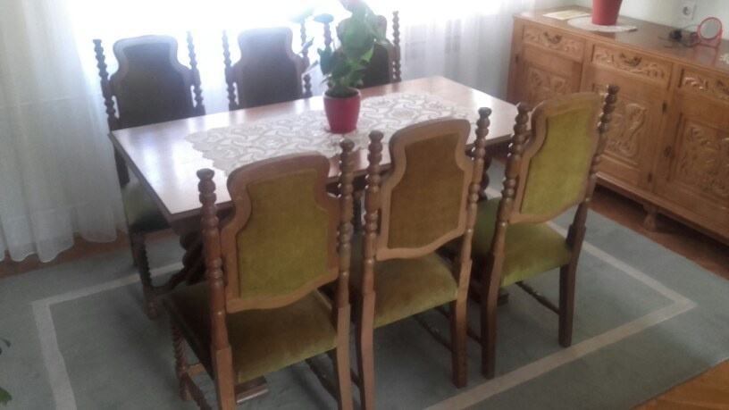 Masivni drveni stol (150x80cm) i šest čvrstih tapeciranih stolaca.
