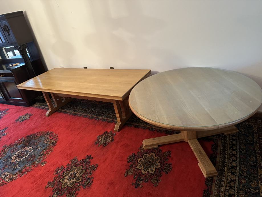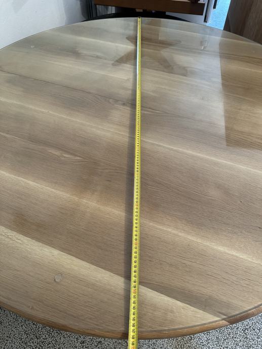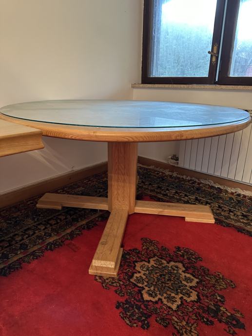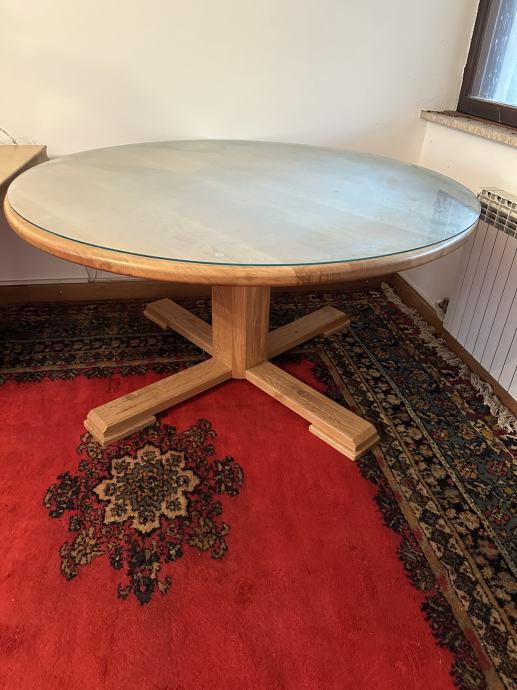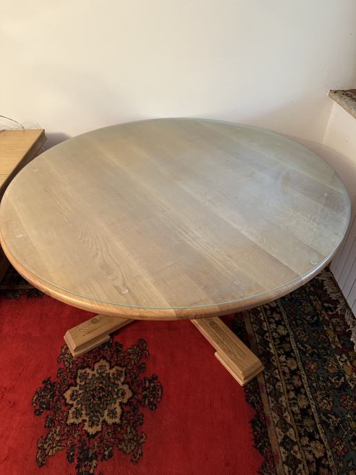 Masivni drveni stol u odličnom stanju, jako malo korišten i jako dobro očuvan, promjera 148cm, dolazi sa zaštitnim staklom.