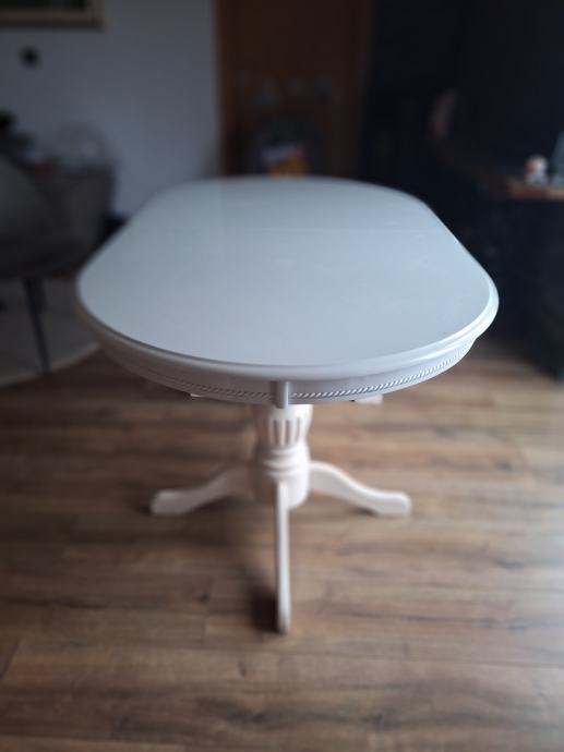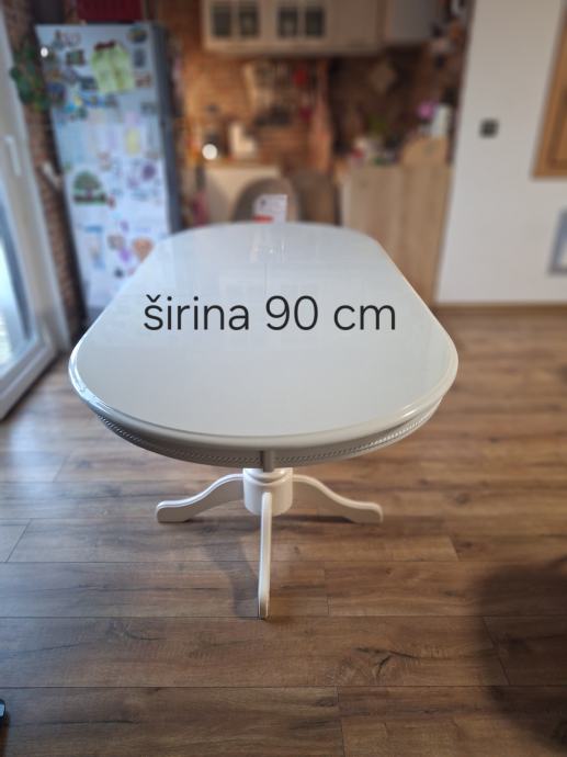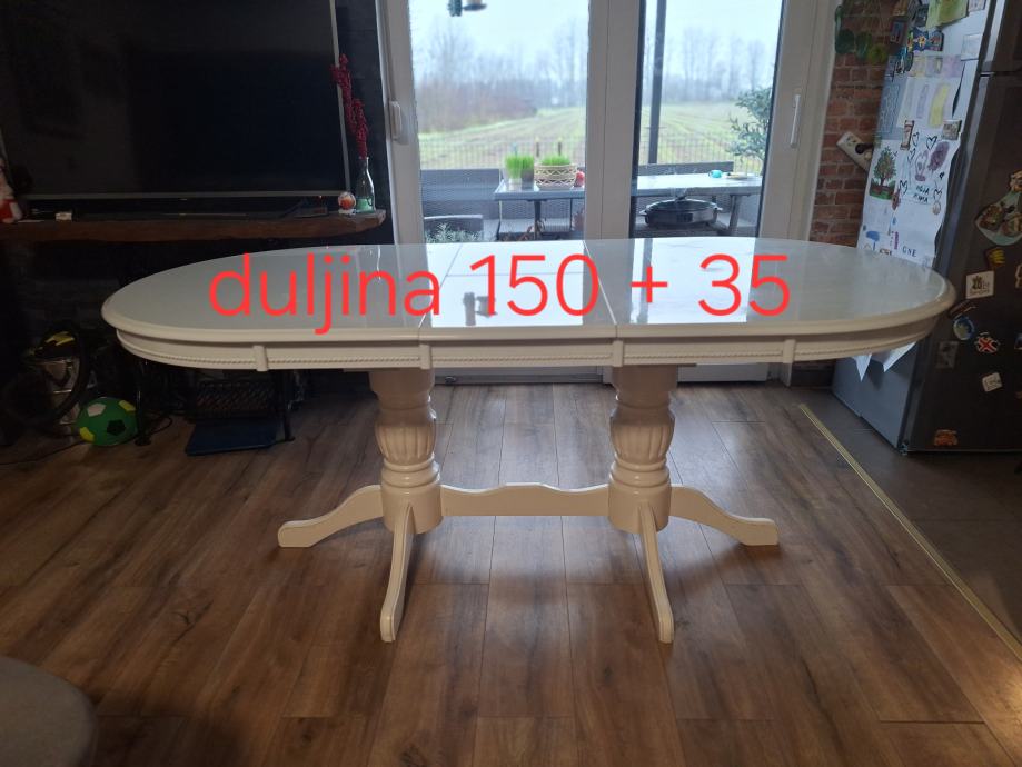 Kvalitetan masivni ovalni stol na razvlačenje 150 (+35 cm), širina 90 cm. Idealan za rustikalno namješten ambienat ili kuće za odmor.