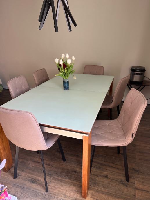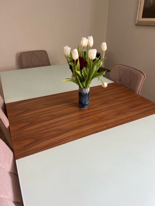 Prodajem moderan i elegantan blagovaonski stol s čvrstim drvenim nogama i gornjom pločom od mat stakla.