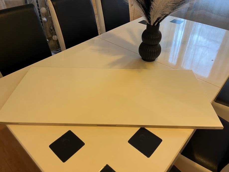Elegantni set namještaja za blagovaonicu, koji se sastoji od pravokutnog stola s bijelom sjajnom površinom koja savršeno reflektira staklo, čime se proširuje prostor sobe, i čvrste baze.