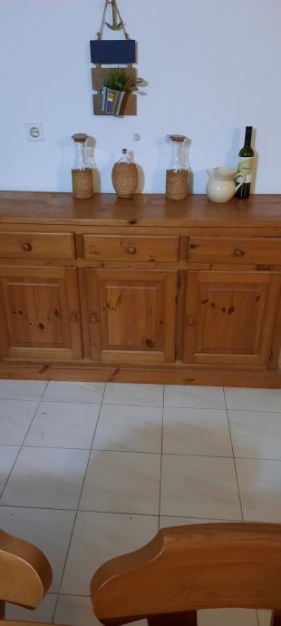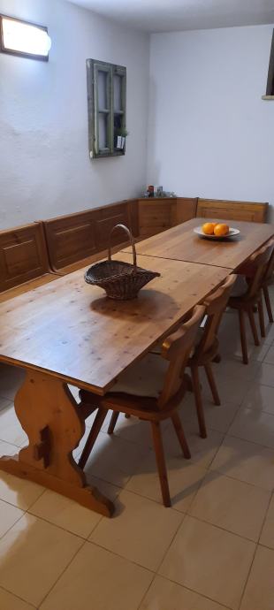 Dva stola sa pripadajućim klupama i kutom sa stolicama i komodom.