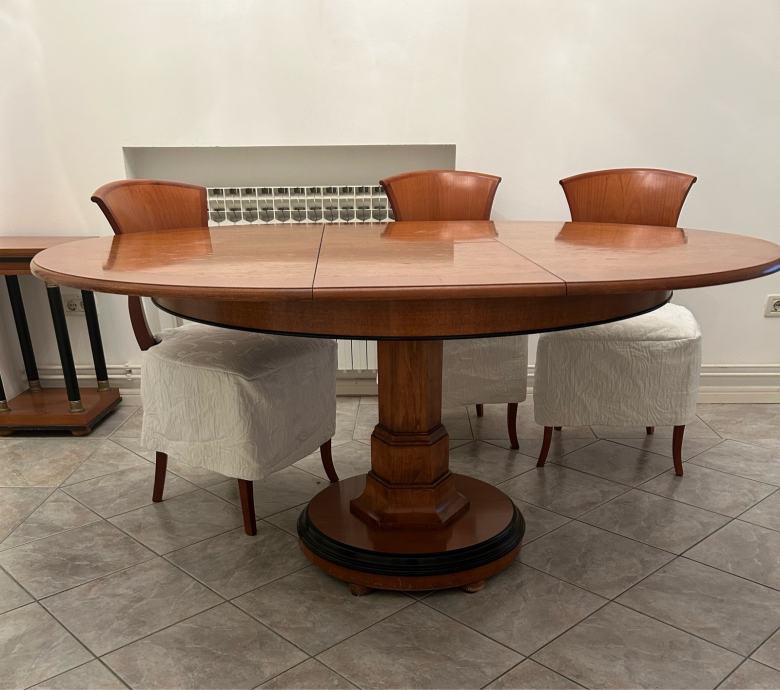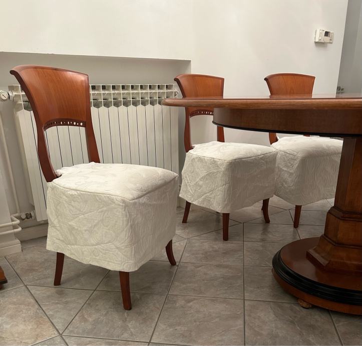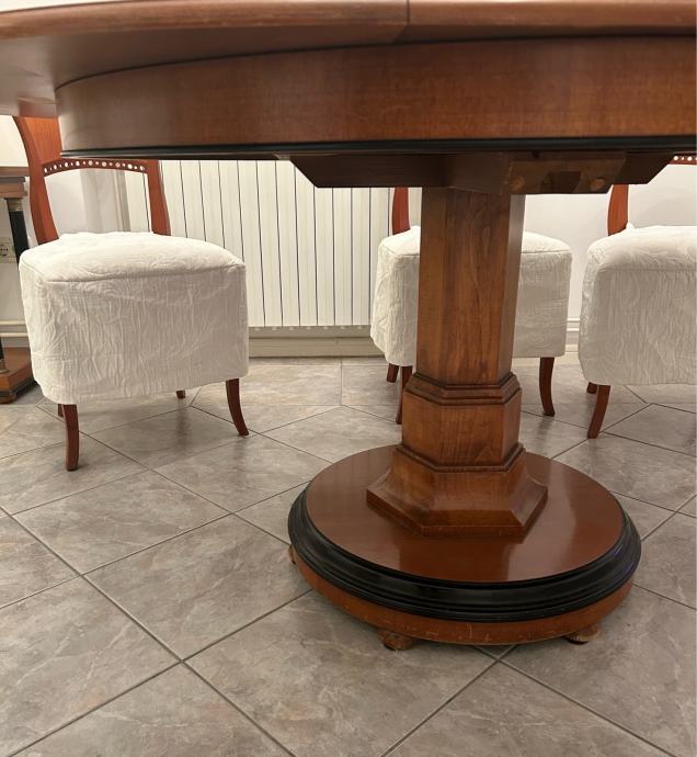 Okrugli stol(120cm), moguće rastegnuti na 160cm. Osam stolica sa šivenim zaštitama, u odličnom stanju. Rad slovenske firme Stiles. Isporuka Volosko/zagreb