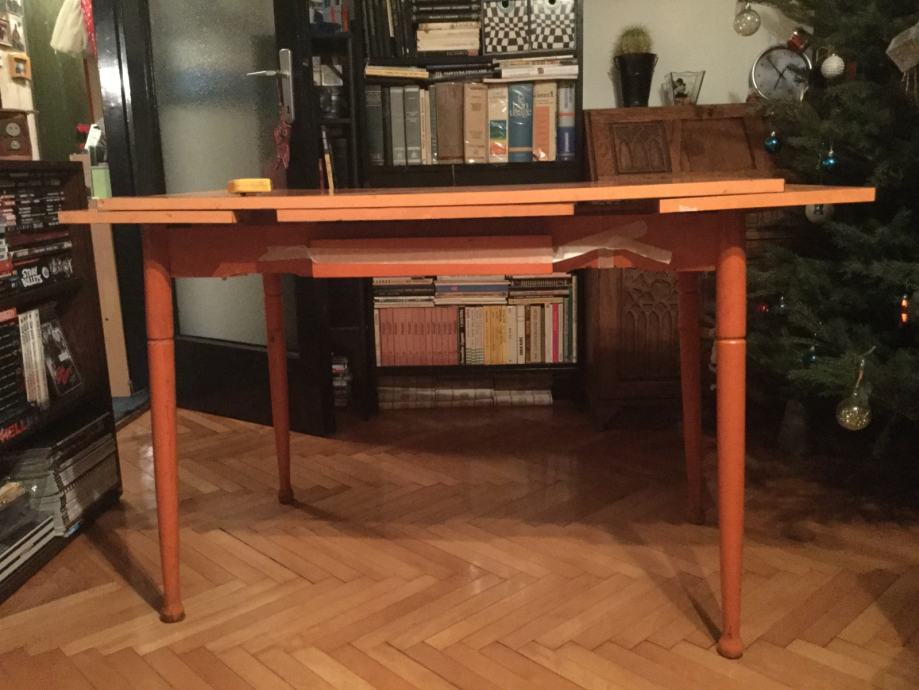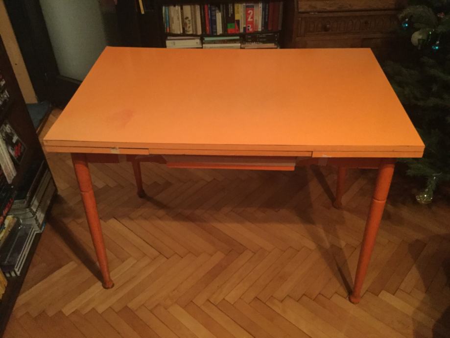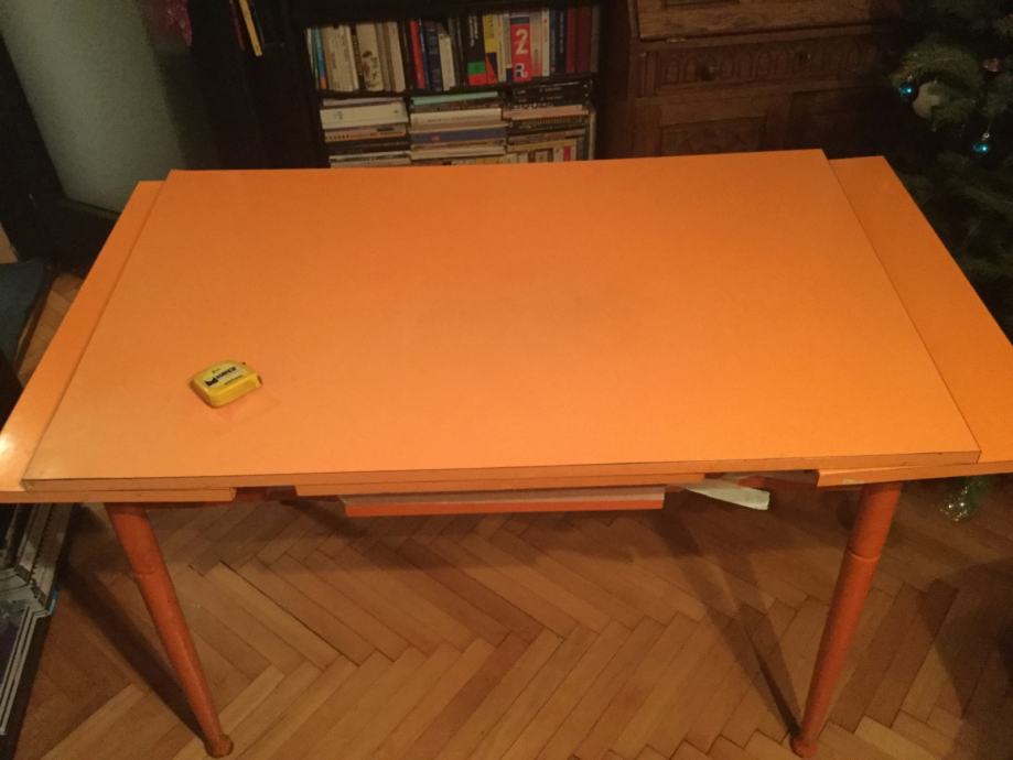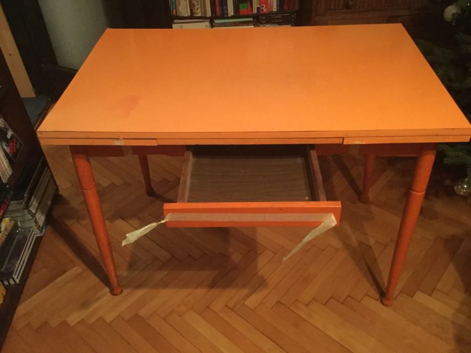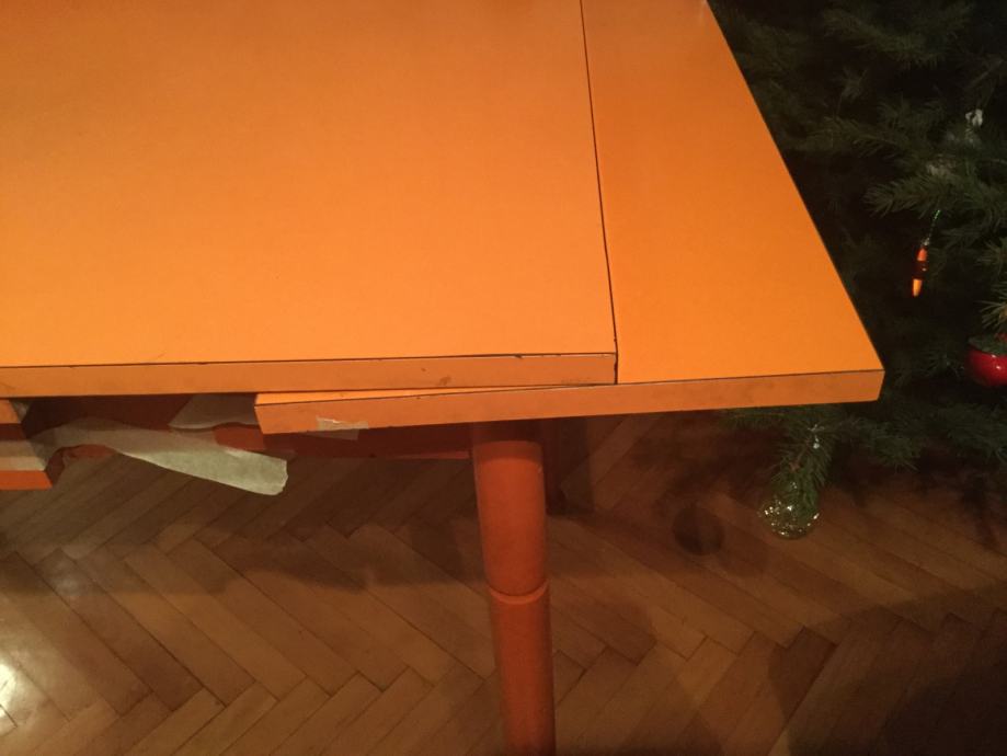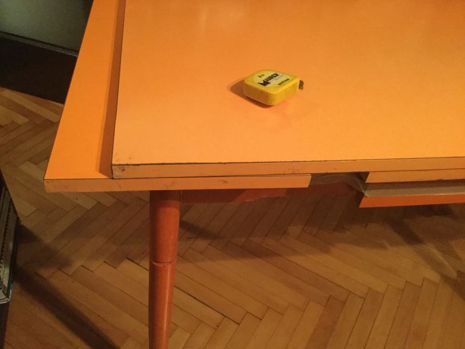 Stol je korišten ali je u dobrom stanju. površina je od ultrapasa sjajne narančaste boje ( lako se odrzava) a noge su drvene i može ih se odšarafiti. produžeci se lako izvlače. ima i malu ladicu