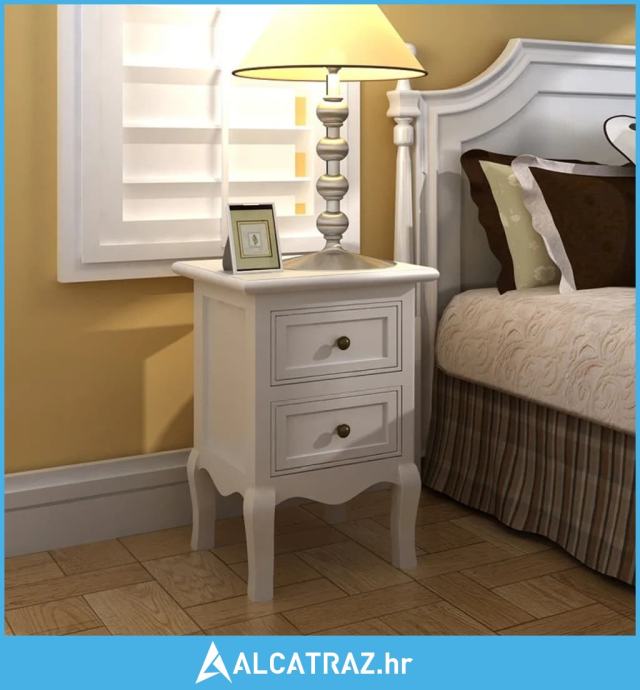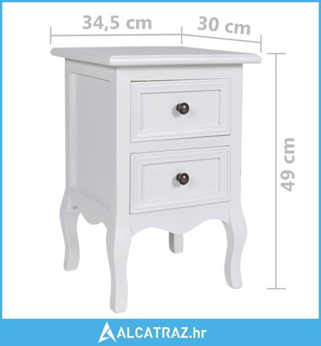Svaki primjerak ima dvije ladice. Strane ladica od pravog drva premazanog prozirnim lakom čine ovaj noćni ormarić još elegantnijim. Noćni stolić obložen je izdržljivim bijelim MDF-om. Također ima sužene noge i brušene niklovane ručice.